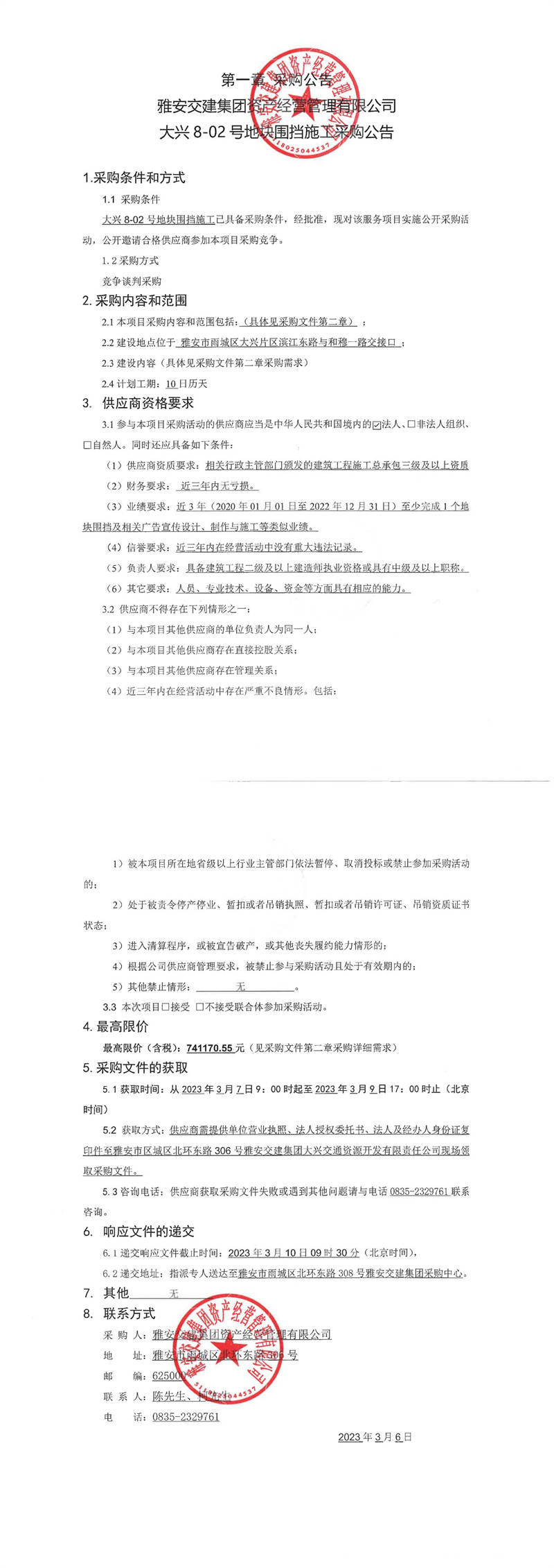 雅安交建集團(tuán)資產(chǎn)經(jīng)營(yíng)管理有限公司大興8-02號(hào)地塊圍擋施工采購(gòu)公告