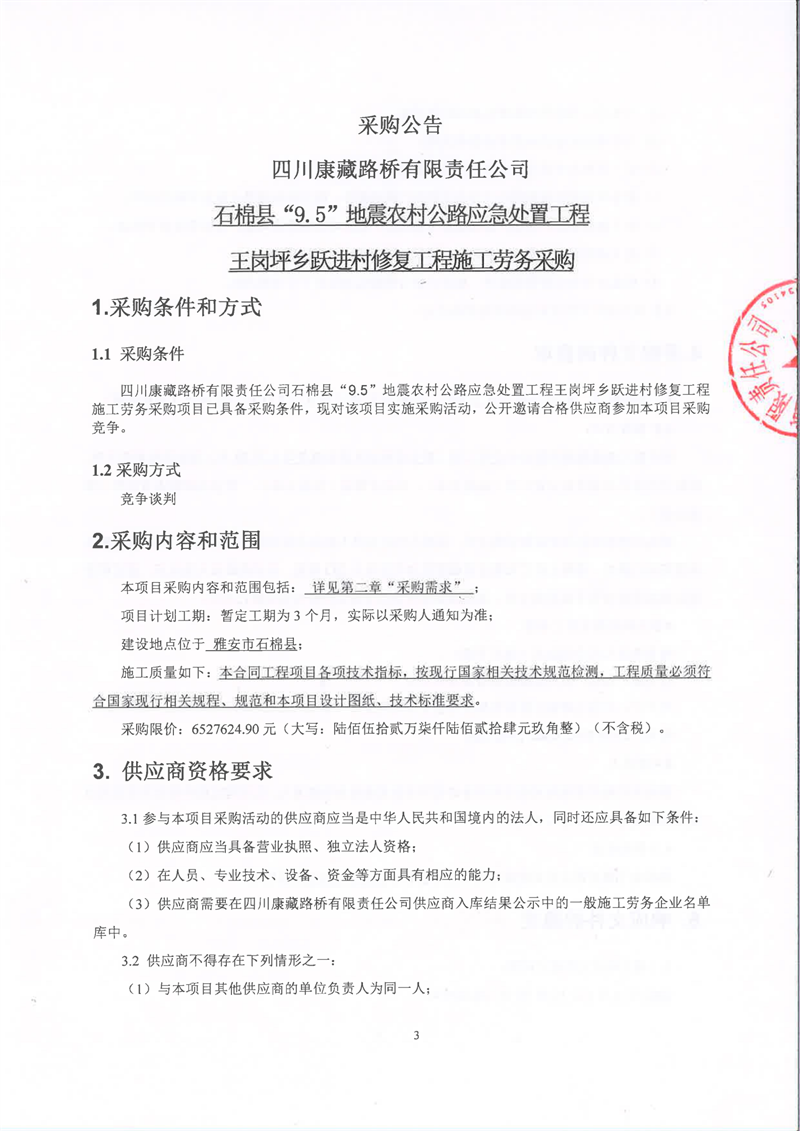 四川康藏路橋有限責(zé)任公司石棉縣“9.5”地震農(nóng)村公路應(yīng)急處置工程王崗坪鄉(xiāng)躍進(jìn)村修復(fù)工程施工勞務(wù)采購公告