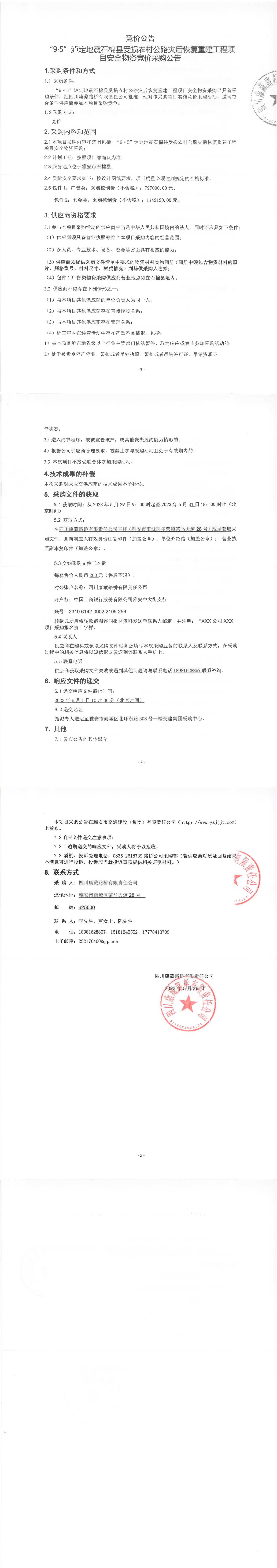 四川康藏路橋有限責(zé)任公司“9.5”瀘定地震石棉縣受損農(nóng)村公路災(zāi)后恢復(fù)重建工程項目安全物資競價采購公告