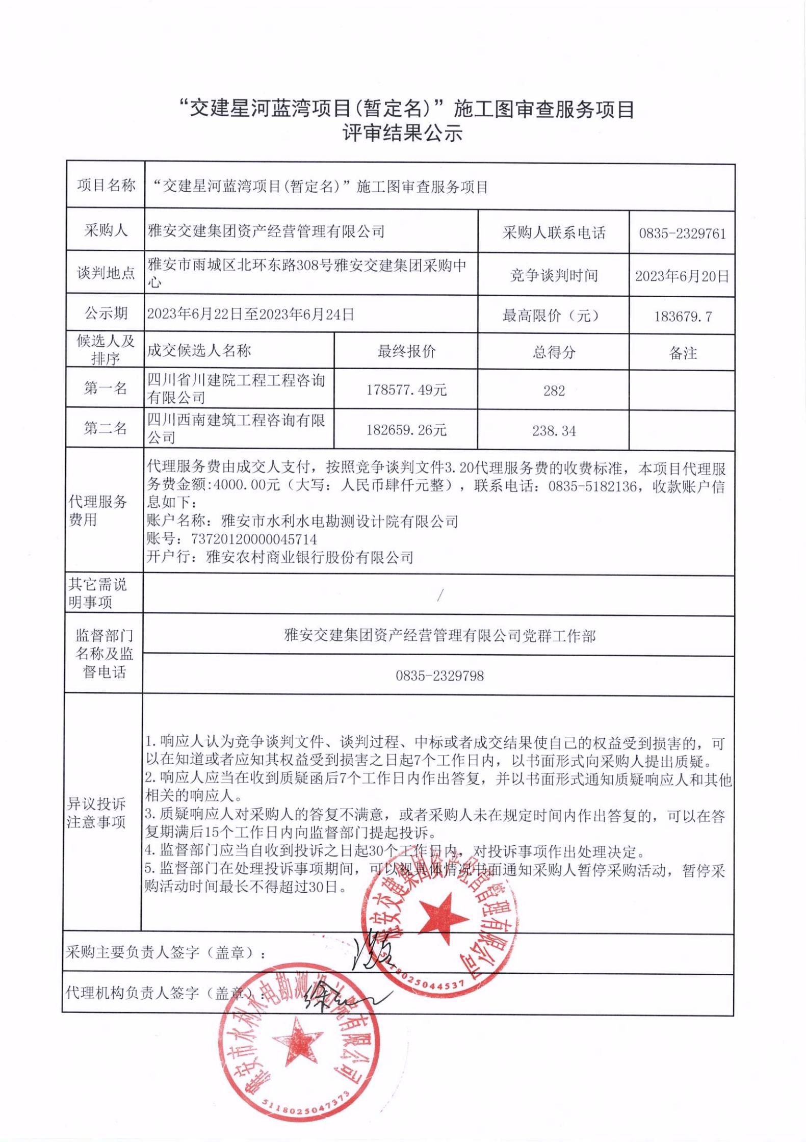 雅安交建集團(tuán)資產(chǎn)經(jīng)營管理有限公司“交建星河藍(lán)灣項(xiàng)目(暫定名)”施工圖審查服務(wù)項(xiàng)目評審結(jié)果公示