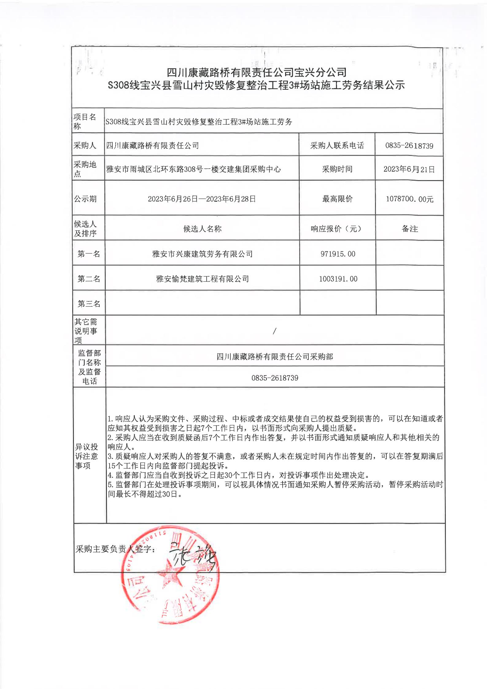 四川康藏路橋有限責(zé)任公司寶興分公司S308線寶興縣雪山村段災(zāi)毀修復(fù)整治工程3#場站施工勞務(wù)結(jié)果公示