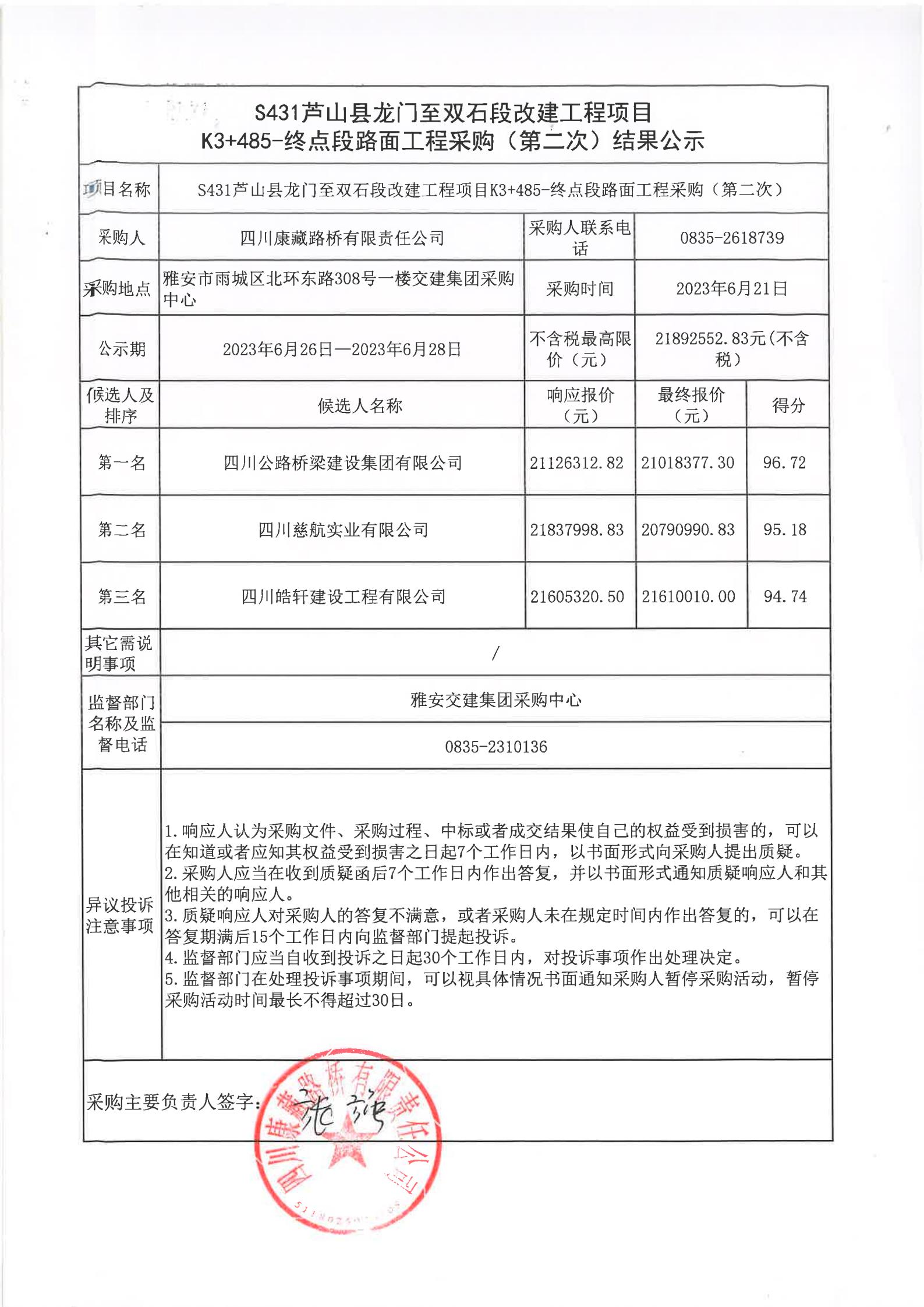 四川康藏路橋有限責任公司S431蘆山縣龍門至雙石段改建工程項目K3+485-終點段路面工程采購(第二次)結(jié)果公示