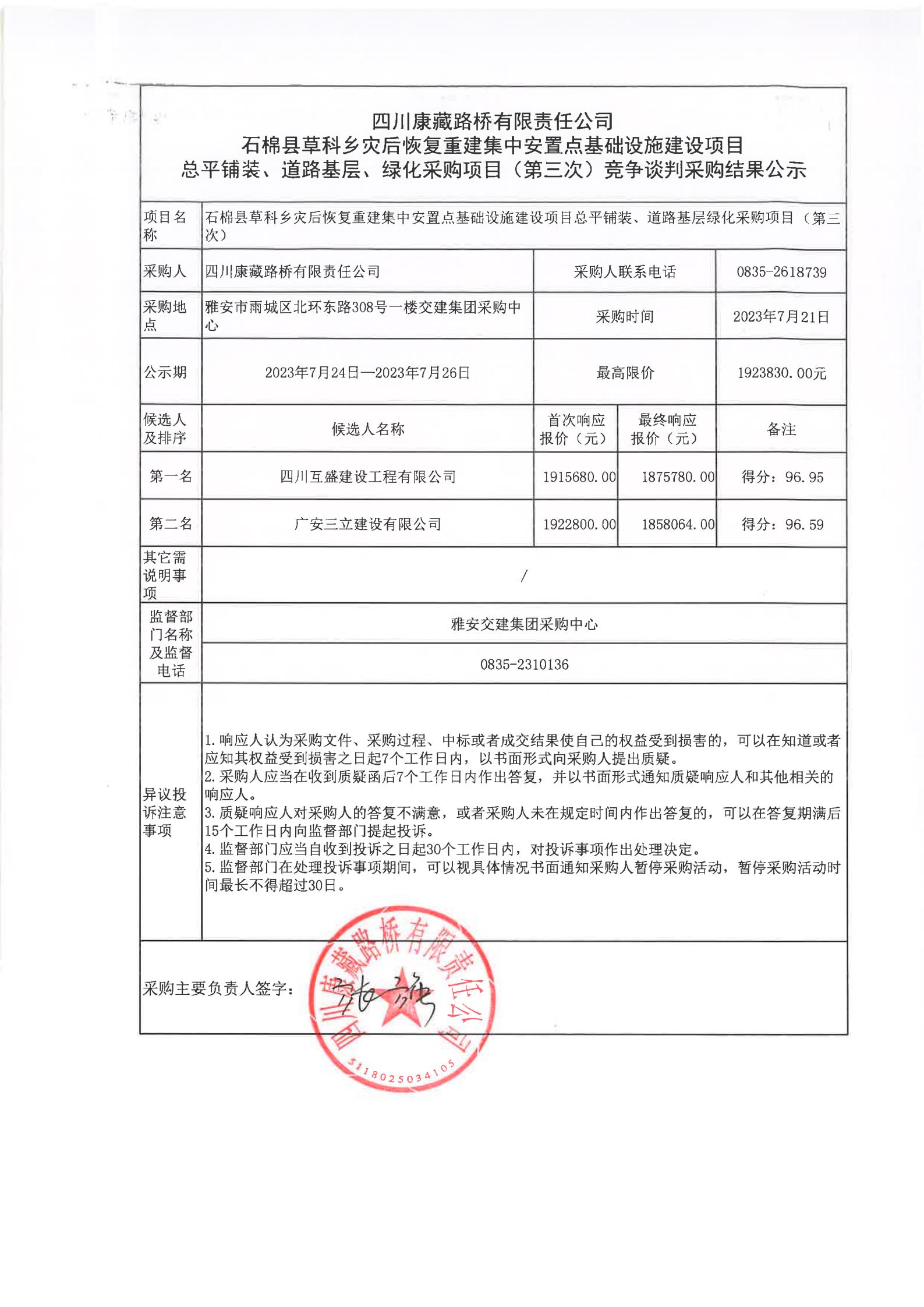 四川康藏路橋有限責(zé)任公司石棉縣草科鄉(xiāng)災(zāi)后恢復(fù)重建集中安置點(diǎn)基礎(chǔ)設(shè)施建設(shè)項(xiàng)目總平鋪裝、道路基層、綠化采購項(xiàng)目(第三次)競爭談判采購結(jié)果公示