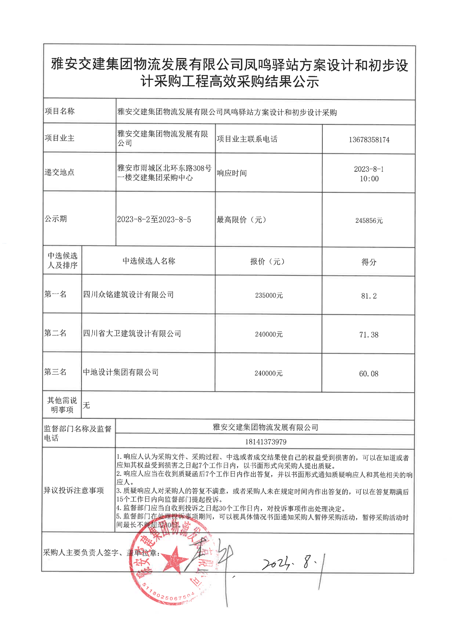 雅安交建集團物流發(fā)展有限公司鳳鳴驛站方案設(shè)計和初步設(shè)計采購工程高效采購結(jié)果公示