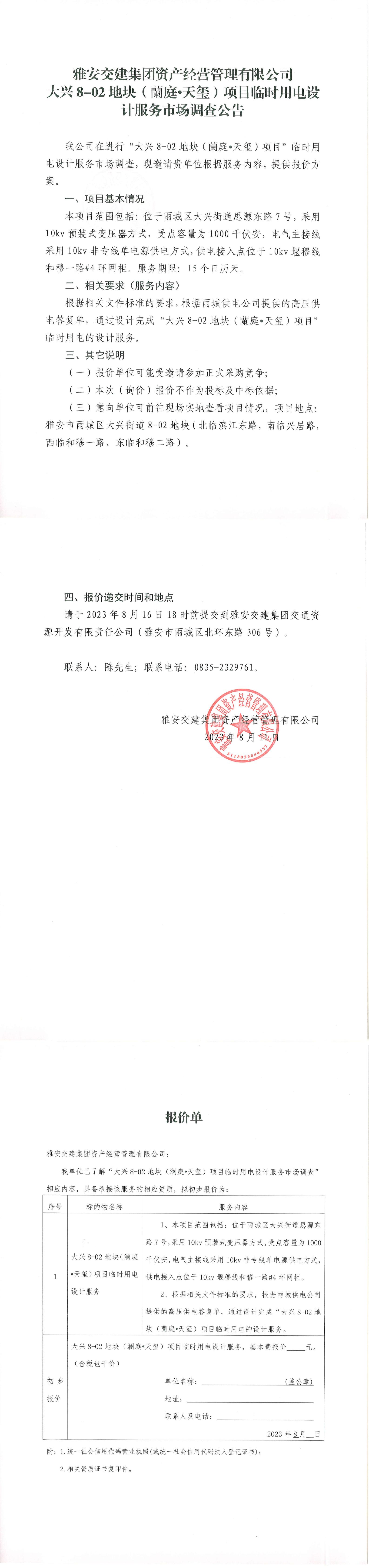 雅安交建集團資產(chǎn)經(jīng)營管理有限公司大興8-02地塊(蘭庭·天璽)項目臨時用電設(shè)計服務(wù)市場調(diào)查公告