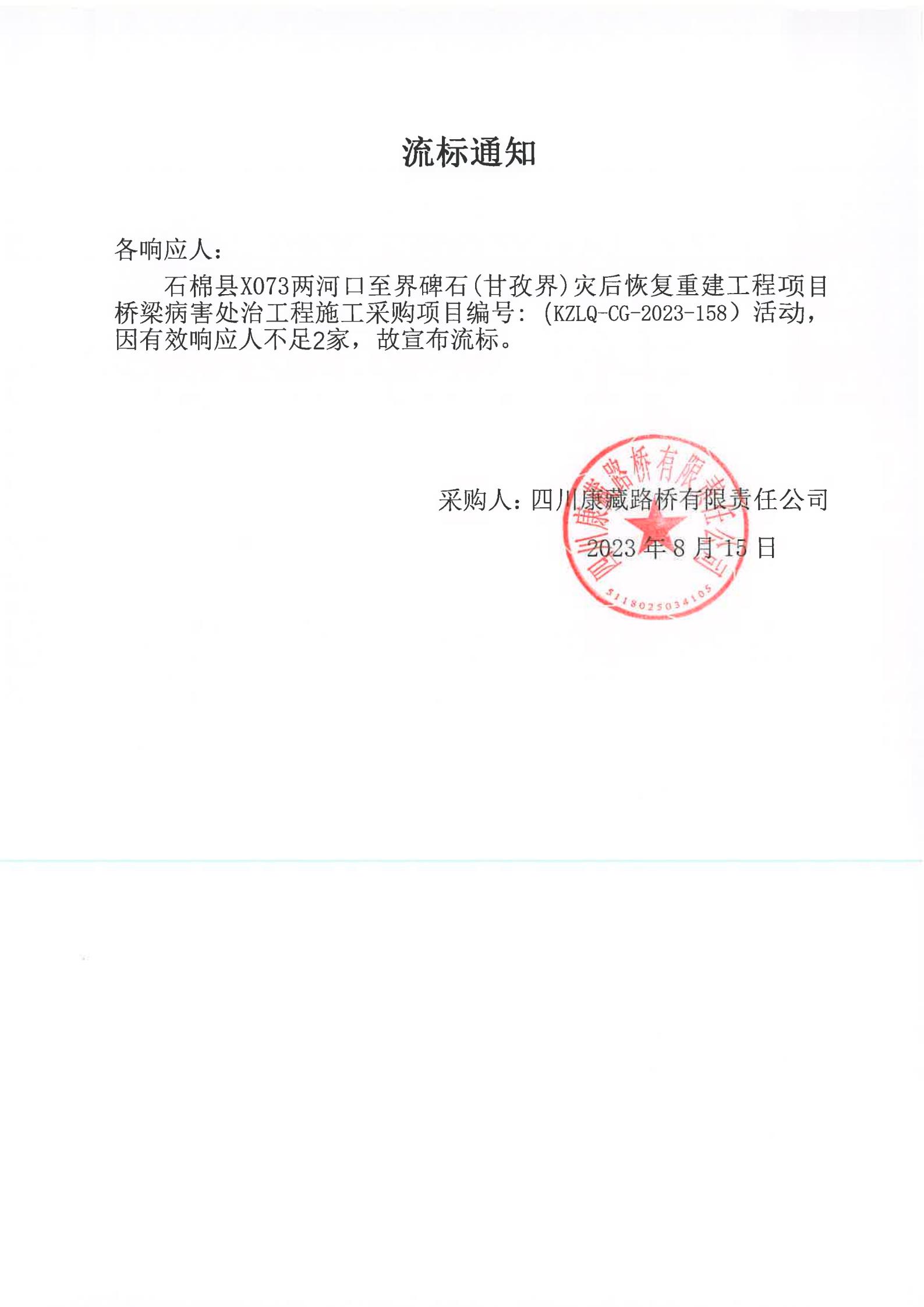 四川康藏路橋有限責任公司石棉縣X703兩河口至界碑石(甘孜界)災(zāi)后恢復(fù)重建工程項目橋梁病害處治工程施工流標通知