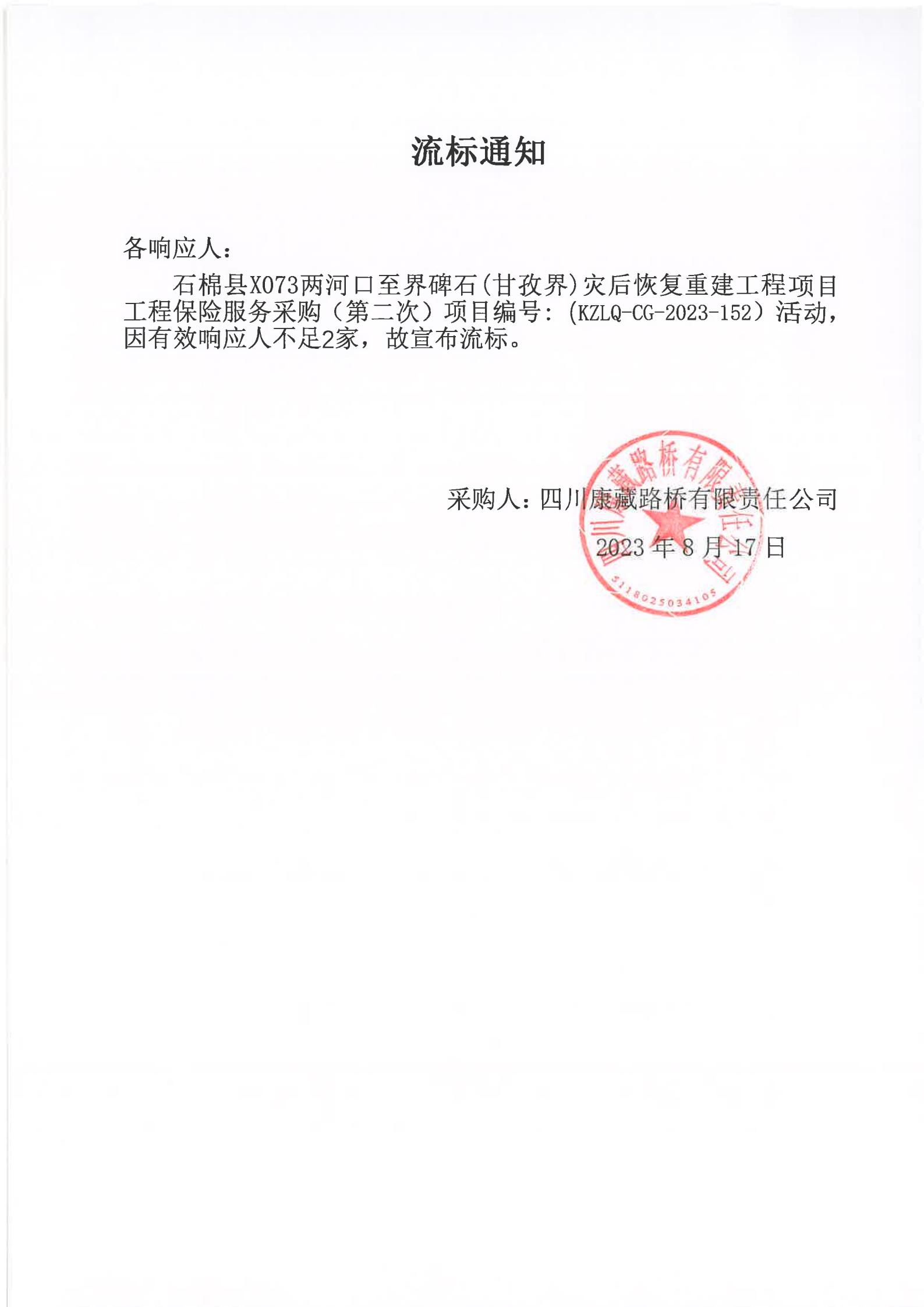 四川康藏路橋有限責任公司石棉縣X073兩河口至界碑石(甘孜界)災(zāi)后恢復重建工程項目工程保險服務(wù)采購(第二次)流標通知