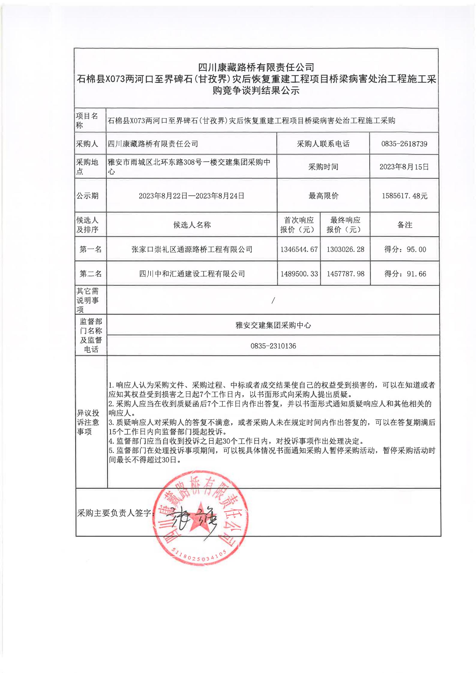 四川康藏路橋有限責(zé)任公司石棉縣X073兩河口至界碑石(甘孜界)災(zāi)后恢復(fù)重建工程項目橋梁病害處治工程施工采購競爭談判結(jié)果公示