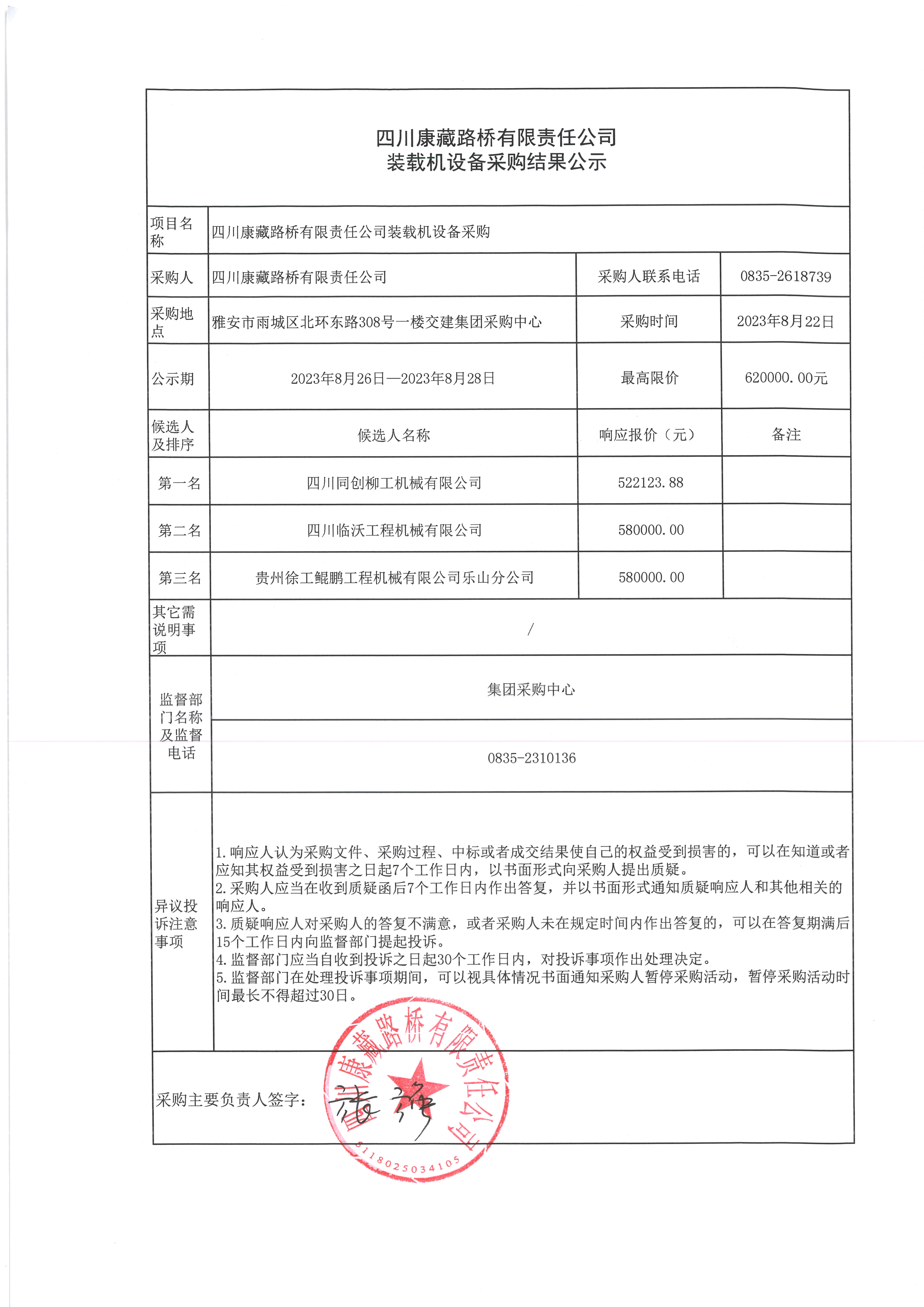 四川康藏路橋有限責任公司裝載機設備采購結果公示