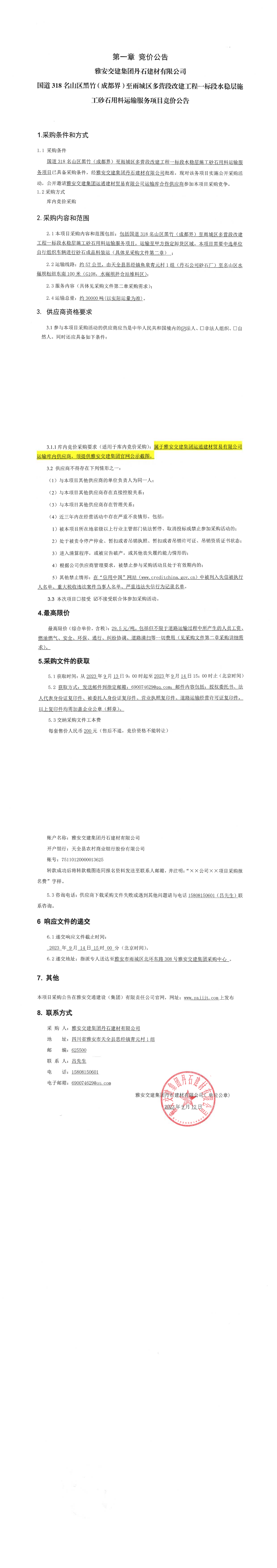 雅安交建集團(tuán)丹石建材有限公司國(guó)道318名山區(qū)黑竹(成都界)至雨城區(qū)多營(yíng)段改建工程一標(biāo)段水穩(wěn)層施工砂石用料運(yùn)輸服務(wù)項(xiàng)目競(jìng)價(jià)公告