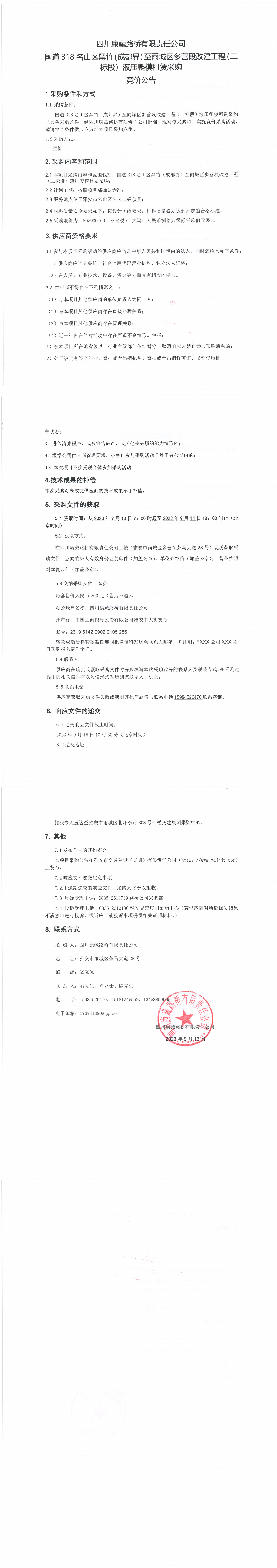四川康藏路橋有限責(zé)任公司國(guó)道318名山區(qū)黑竹(成都界)至雨城區(qū)多營(yíng)段改建工程(二標(biāo)段)液壓爬模租賃采購競(jìng)價(jià)公告