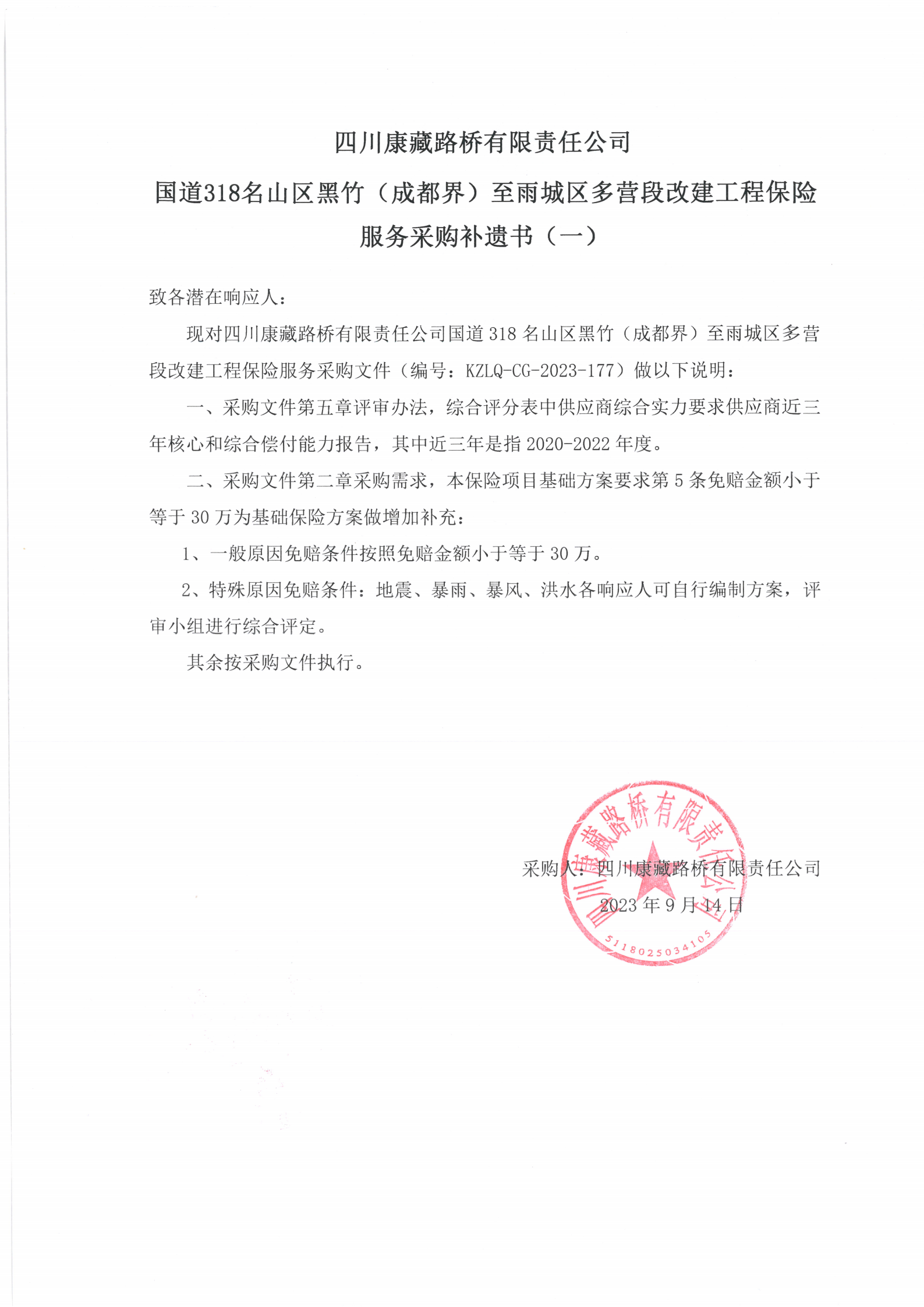 四川康藏路橋有限責(zé)任公司國道318名山區(qū)黑竹(成都界)至雨城區(qū)多營段改建工程保險(xiǎn)服務(wù)采購補(bǔ)遺書(一)