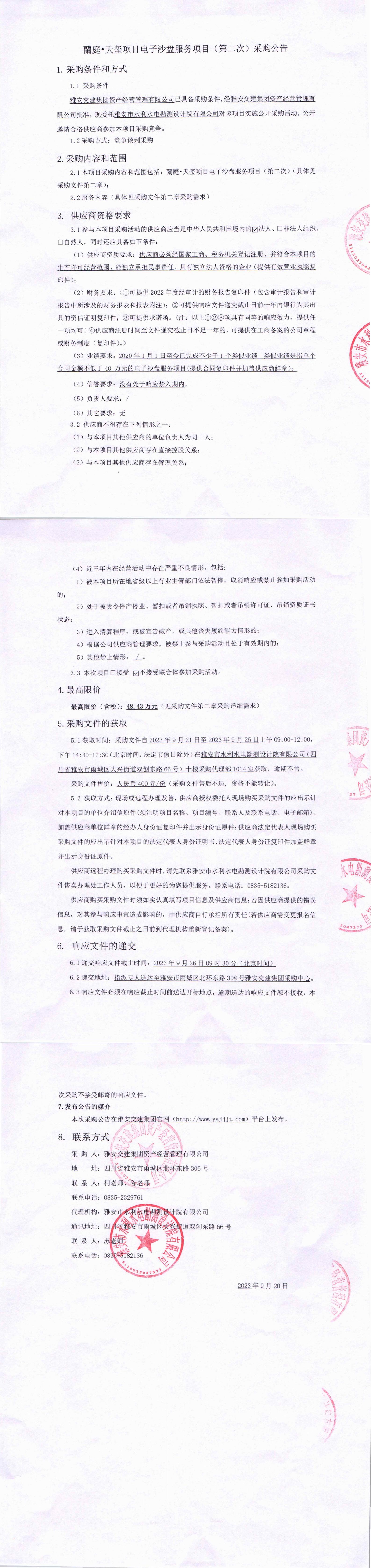 雅安交建集團資產(chǎn)經(jīng)營管理有限公司蘭庭·天璽項目電子沙盤服務(wù)項目(第二次)采購公告