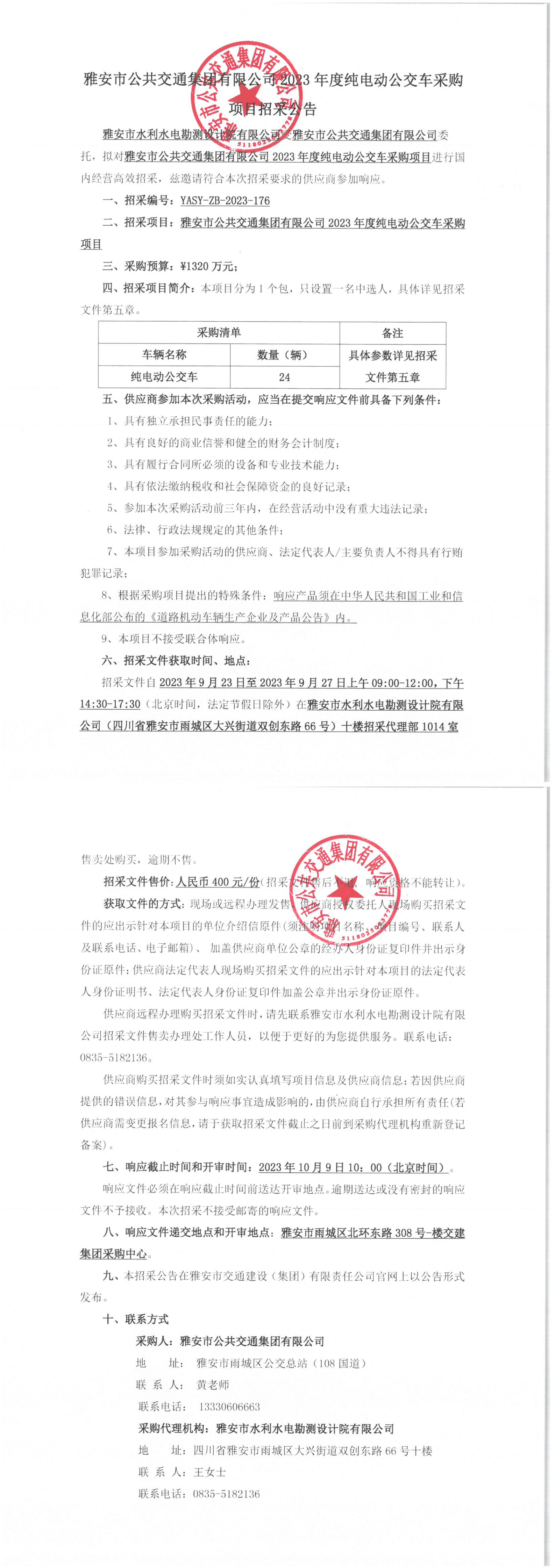 雅安市公共交通集團(tuán)有限公司2023年度純電動(dòng)車公交車采購項(xiàng)目招采公告