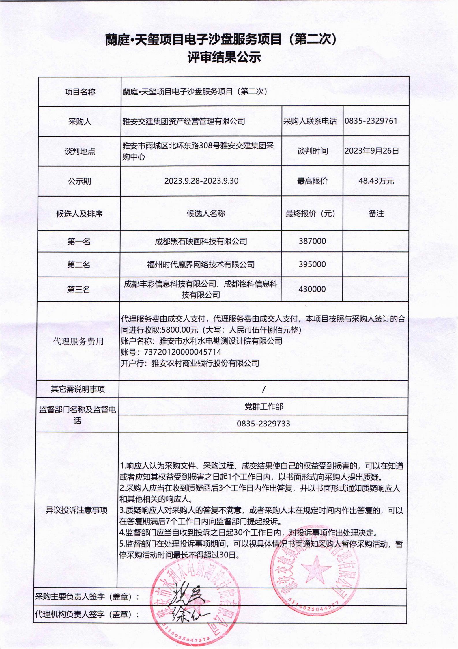 雅安交建集團(tuán)資產(chǎn)經(jīng)營(yíng)管理有限公司蘭庭•天璽項(xiàng)目電子沙盤(pán)服務(wù)項(xiàng)目(第二次)評(píng)審結(jié)果公示