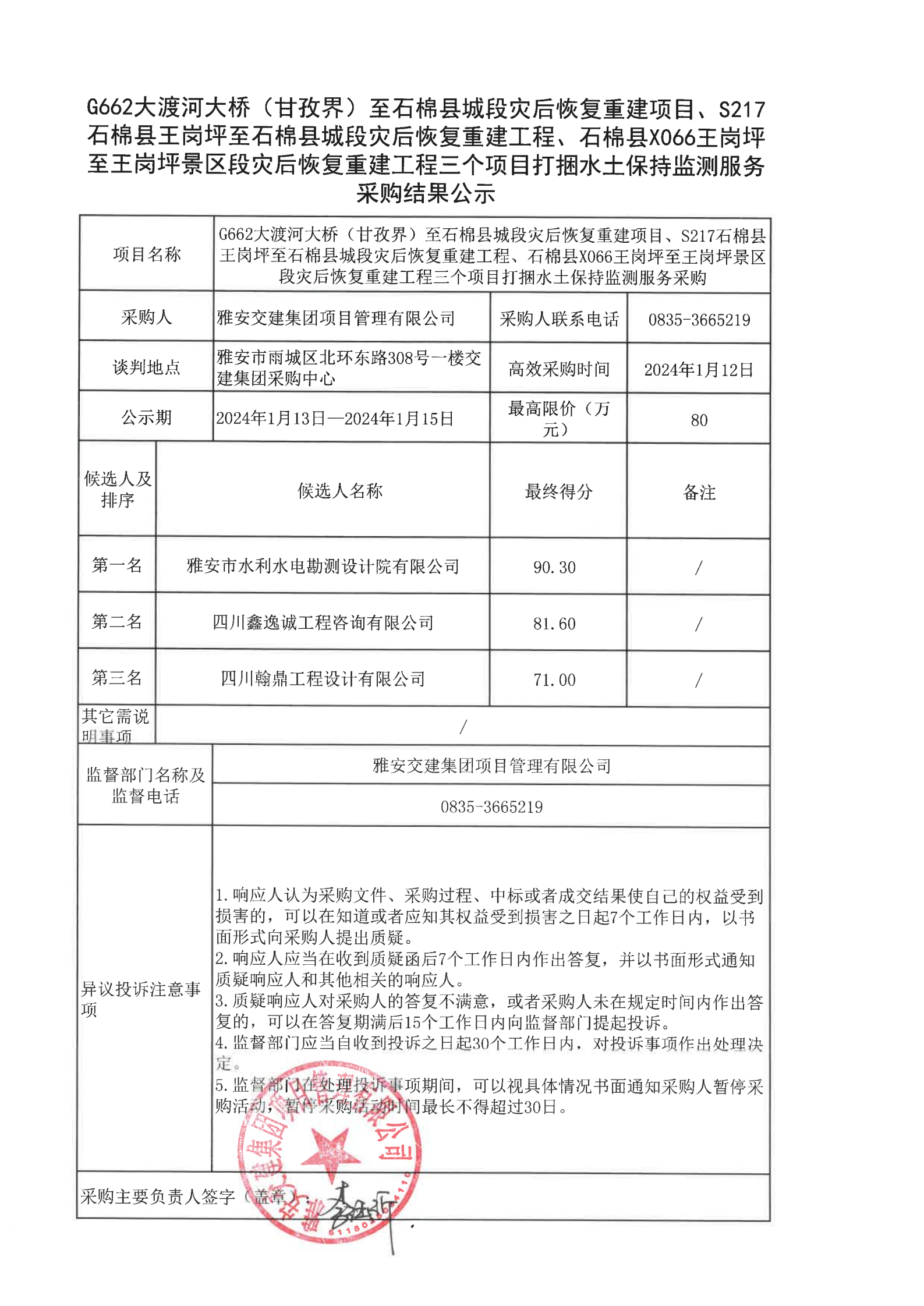 雅安交建集團項目管理有限公司G662大渡河大橋(甘孜界)至石棉縣城段災(zāi)后恢復(fù)重建項目、S217石棉縣王崗坪至石棉縣城段災(zāi)后恢復(fù)重建工程、石棉縣X066王崗坪至王崗坪景區(qū)段災(zāi)后恢復(fù)重建工程三個項目打捆水土保持監(jiān)測服務(wù)采購結(jié)果公示