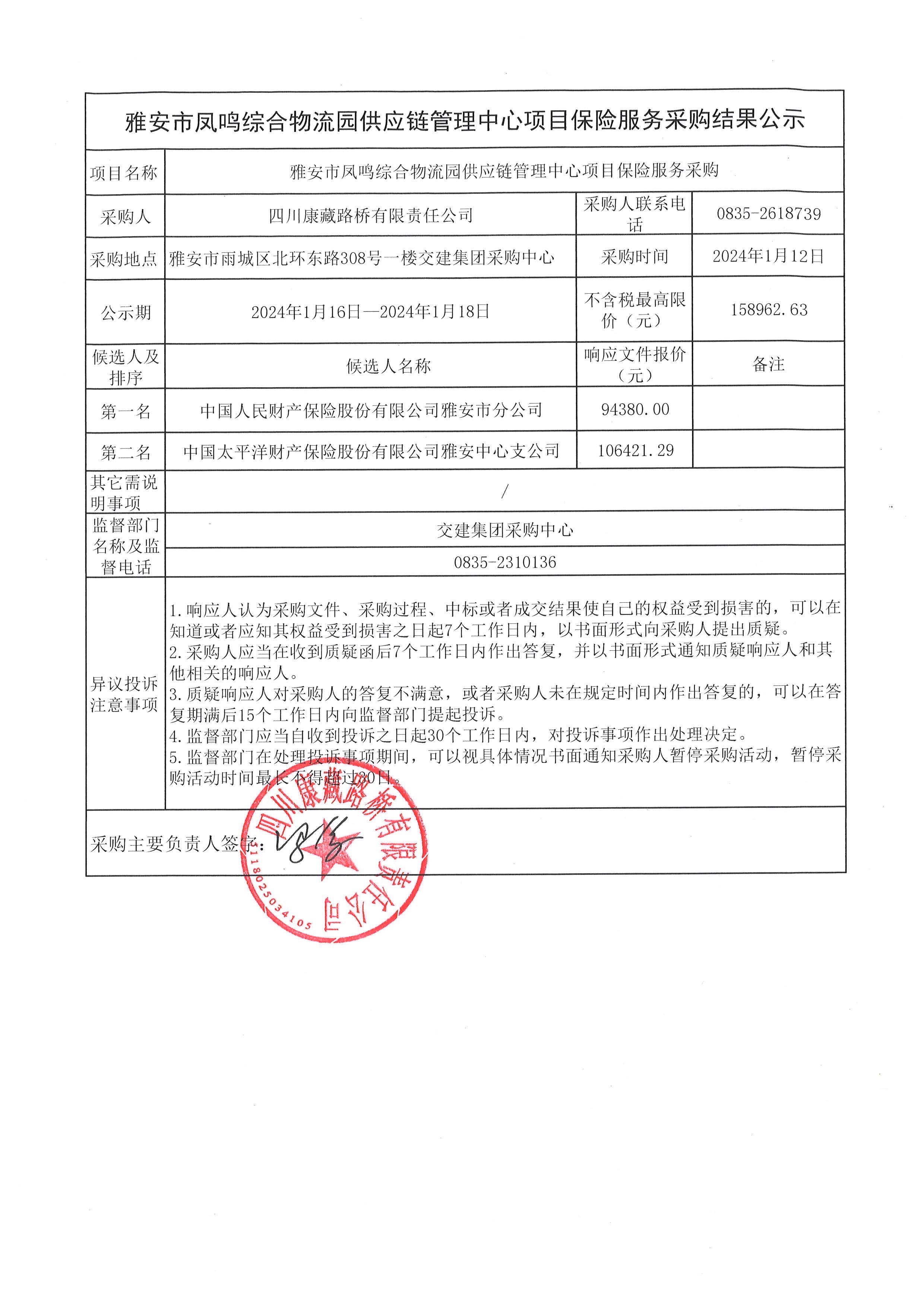 四川康藏路橋有限責任公司雅安市鳳鳴綜合物流園供應(yīng)鏈管理中心項目保險服務(wù)采購結(jié)果公示
