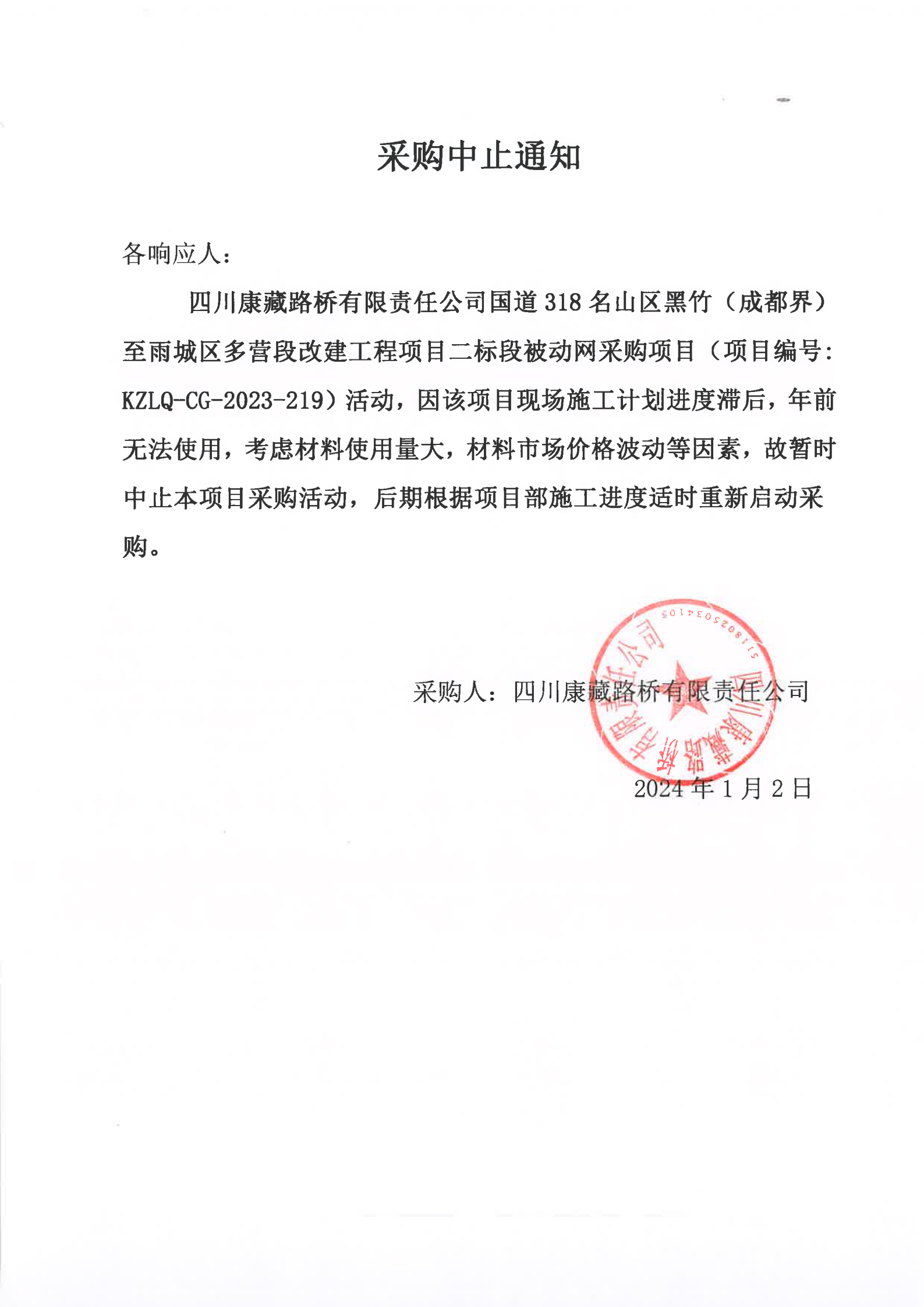 四川康藏路橋有限責(zé)任公司國道318名山區(qū)黑竹(成都界)至雨城區(qū)多營段改建工程項目二標(biāo)段被動網(wǎng)采購項目采購中止通知