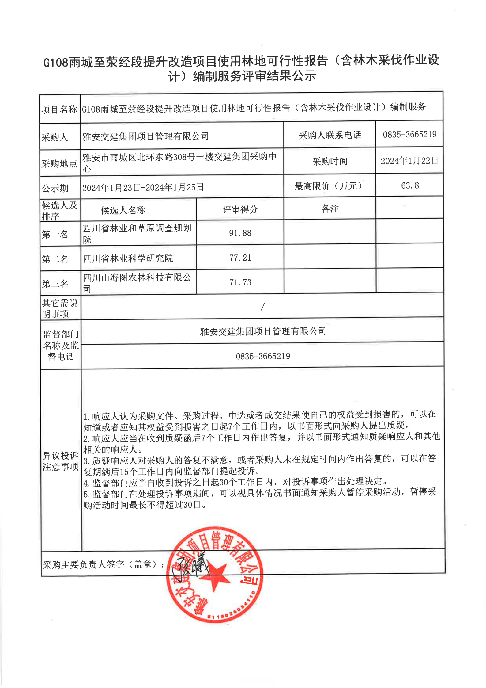 雅安交建集團項目管理有限公司G108雨城至滎經(jīng)段提升改造項目使用林地可行性報告(含林木采伐作業(yè)設計)編制服務評審結果公示