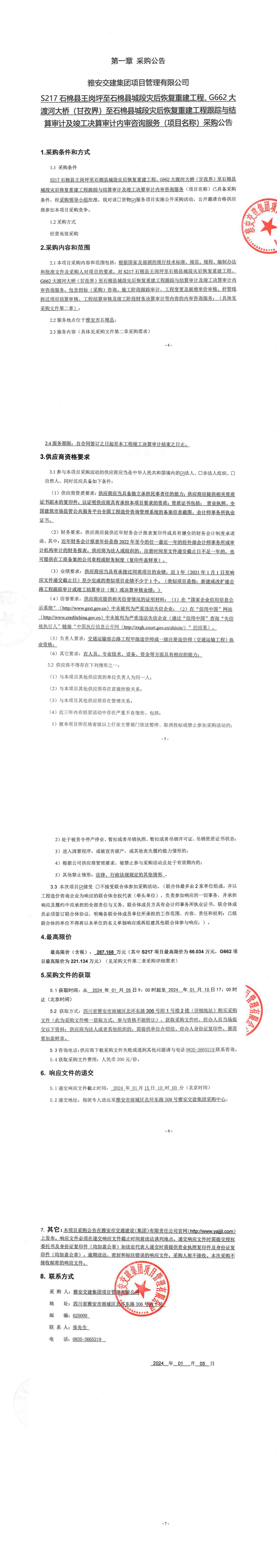 雅安交建集團項目管理有限公司S217石棉縣王崗坪至石棉縣城段災(zāi)后恢復(fù)重建工程、G662大渡河大橋(甘孜界)至石棉縣城段災(zāi)后恢復(fù)重建工程跟蹤與結(jié)算審計及竣工決算審計內(nèi)審咨詢服務(wù)(項目名稱)采購公告