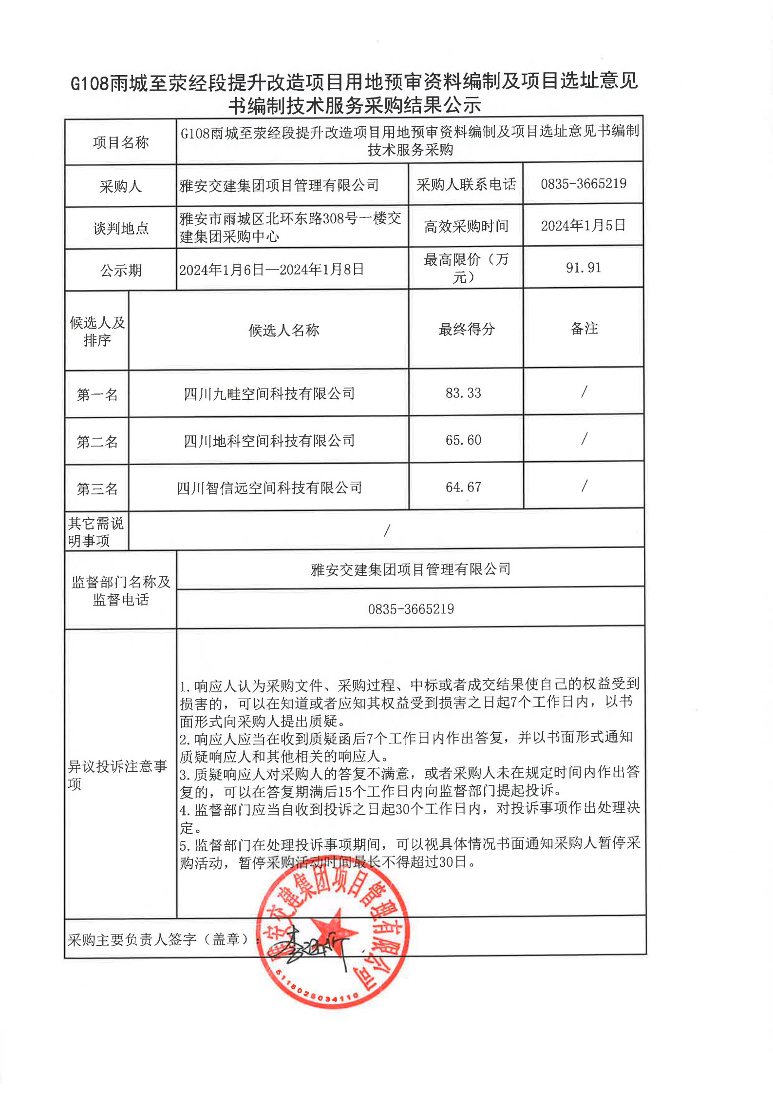 雅安交建集團項目管理有限公司G108雨城至滎經(jīng)段提升改造項目用地預審資料編制及項目選址意見書編制技術(shù)服務采購結(jié)果公示