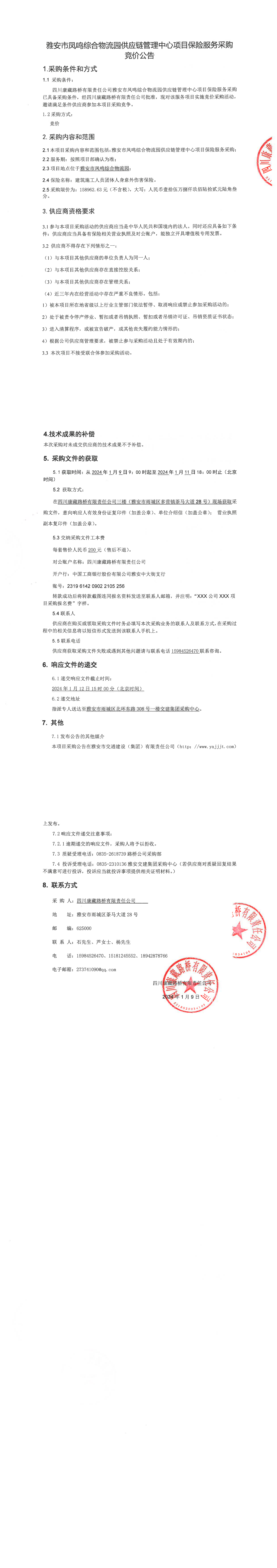 四川康藏路橋有限責(zé)任公司雅安鳳鳴綜合物流園供應(yīng)鏈管理中心項(xiàng)目保險服務(wù)采購競價公告