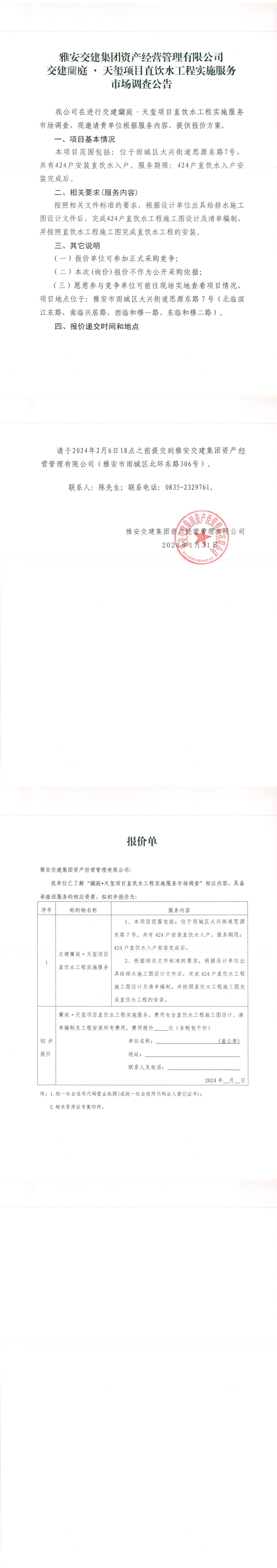 雅安交建集團資產經營管理有限公司交建蘭庭·天璽項目直飲水工程實施服務市場調查公告