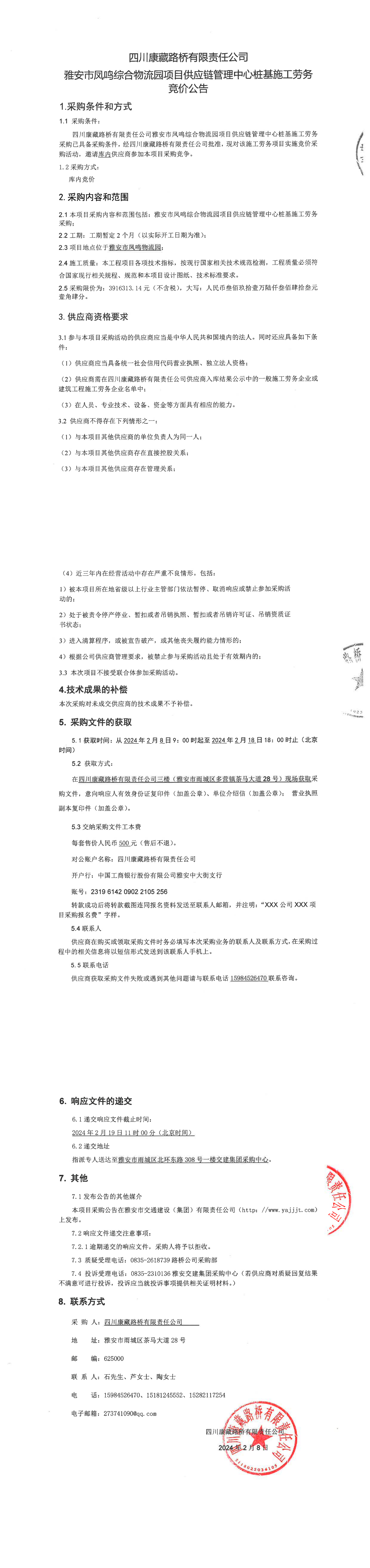 四川康藏路橋有限責(zé)任公司雅安市鳳鳴綜合物流園項(xiàng)目供應(yīng)鏈管理中心樁基施工勞務(wù)采購(gòu)公告