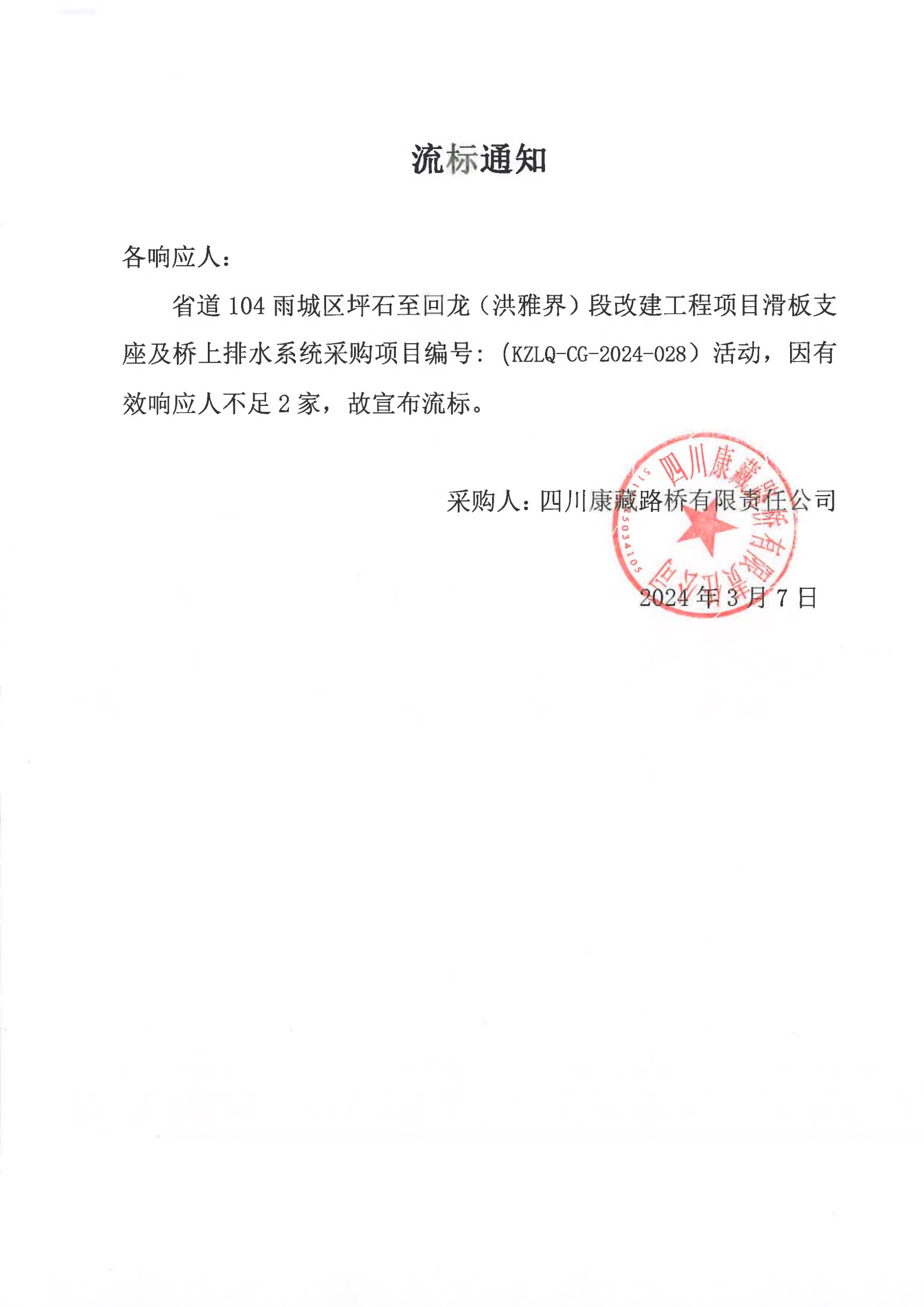 四川康藏路橋有限責任公司省道104雨城區(qū)坪石至回龍(洪雅界)段改建工程項目滑板支座及橋上排水系統(tǒng)流采購標通知