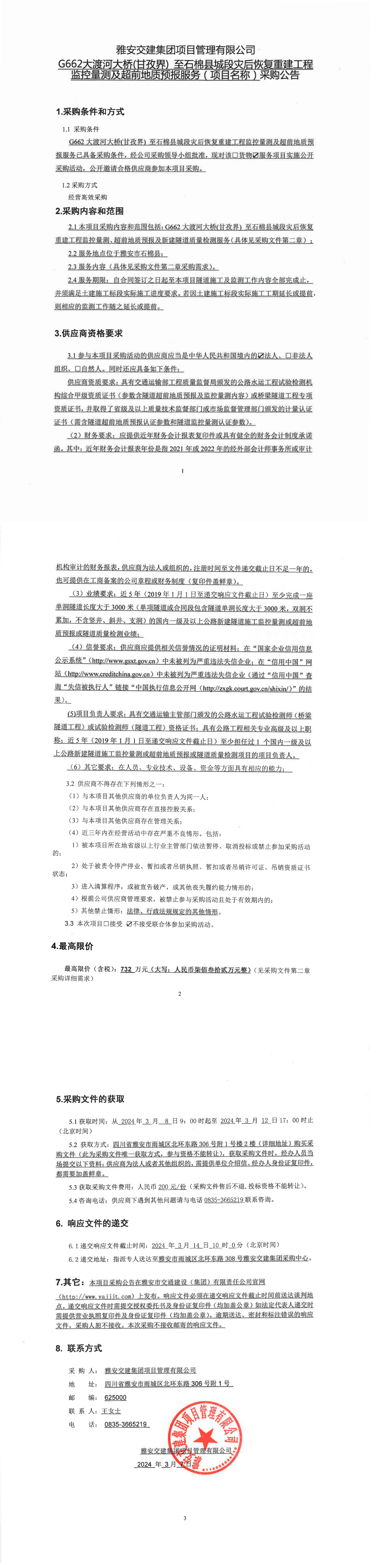 雅安交建集團(tuán)項(xiàng)目管理有限公司G662大渡河大橋(甘孜界)至石棉縣城段災(zāi)后恢復(fù)重建工程監(jiān)控量測(cè)及超前地質(zhì)預(yù)報(bào)服務(wù)(項(xiàng)目名稱)采購公告