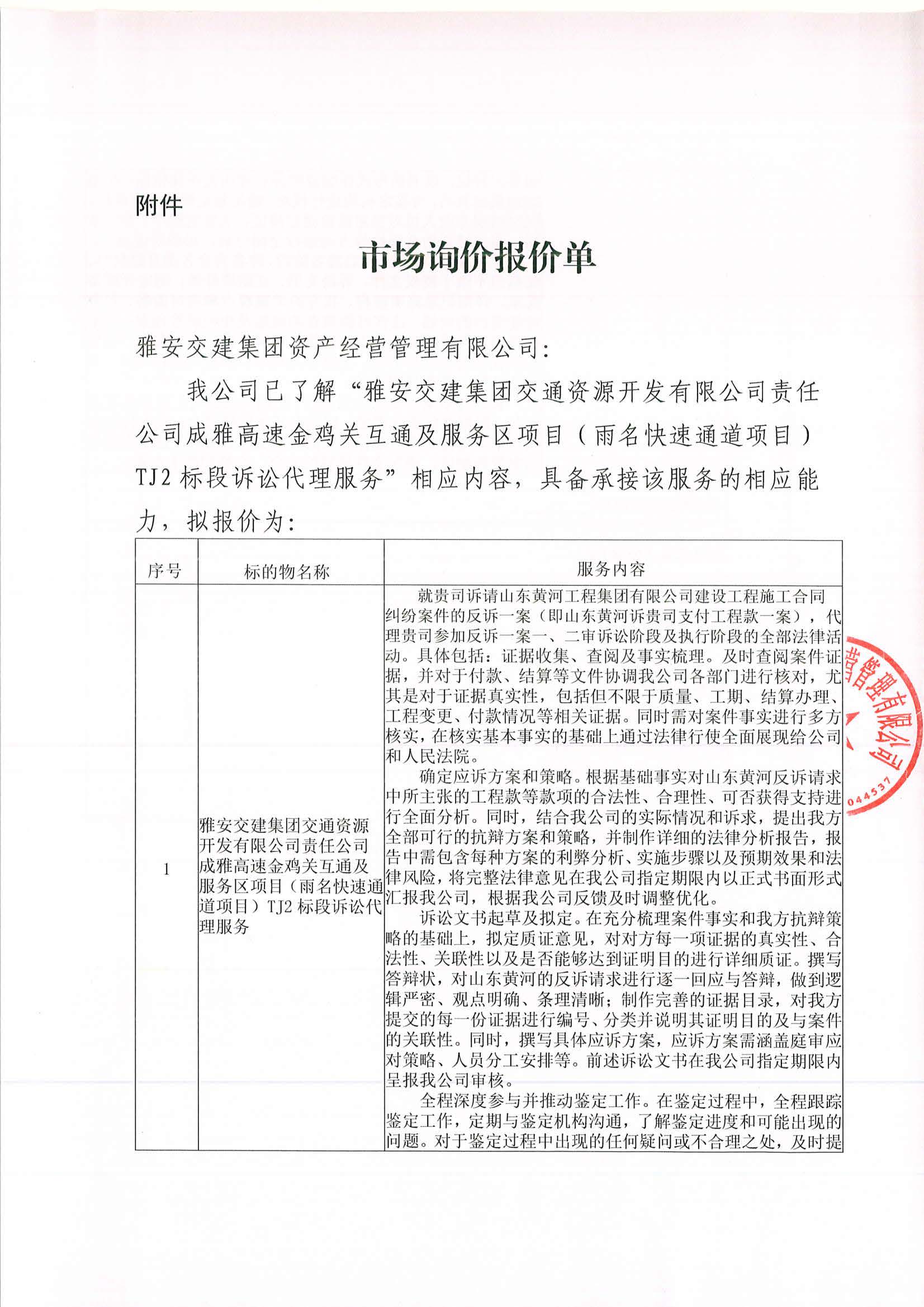 雅安交建集團(tuán)資產(chǎn)經(jīng)營管理有限公司成雅高速金雞關(guān)互通及服務(wù)區(qū)項(xiàng)目(雨名快速通道項(xiàng)目)TJ2標(biāo)段訴訟代理服務(wù)項(xiàng)目市場(chǎng)調(diào)查公告