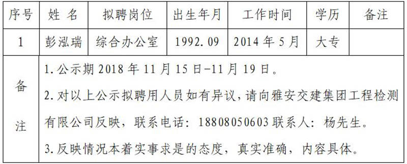 雅安交建集團(tuán)工程檢測有限公司擬聘用人員公示