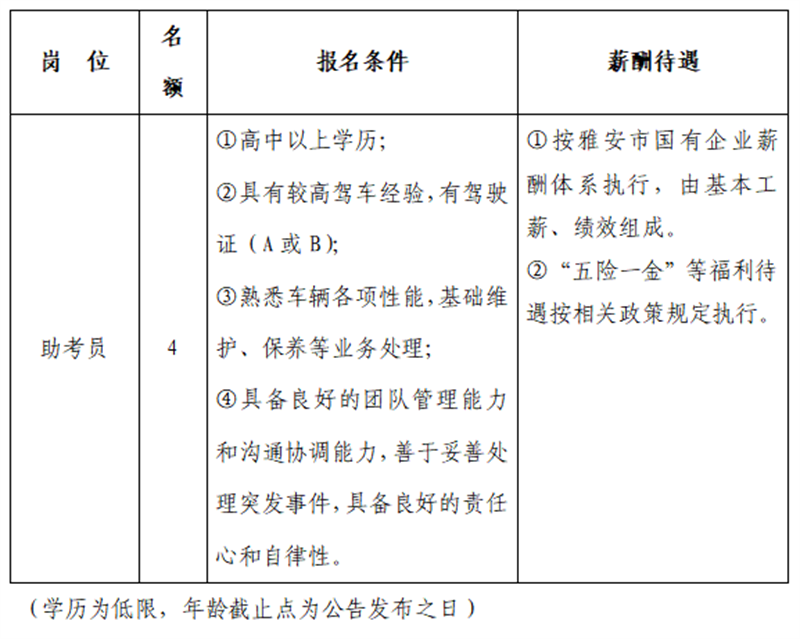 雅安交建集團平順檢測有限公司主要經(jīng)營項目為機動車安全技術檢驗、機動車駕駛員培訓(科目二、三適應性訓練)、機動車環(huán)保定期檢驗、汽車綜合性能檢測等相關業(yè)務。因業(yè)務發(fā)展需要面向社會招聘人員,特公告如下: