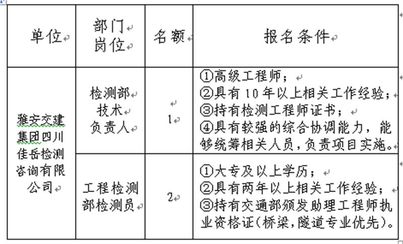 根據(jù)發(fā)展需要,決定面向社會公開招聘雅安市交通建設(shè)(集團)有限責(zé)任公司(以下簡稱“雅安交建集團”)所屬子公司工作人員3名,現(xiàn)將有關(guān)事項公告如下: