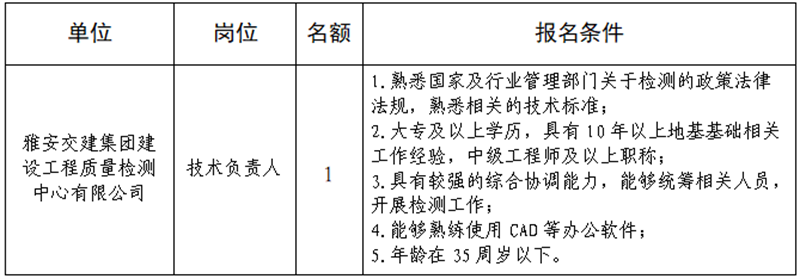 根據(jù)發(fā)展需要,決定面向社會公開招聘雅安市交通建設(shè)(集團(tuán))有限責(zé)任公司(以下簡稱“雅安交建集團(tuán)”)所屬子公司工作人員1名,現(xiàn)將有關(guān)事項(xiàng)公告如下: