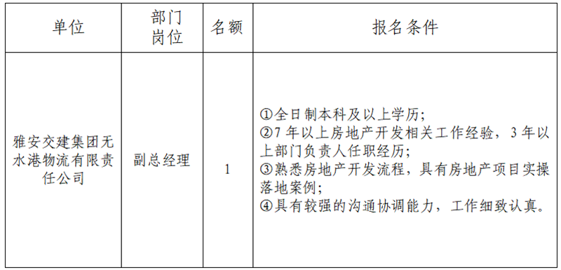 根據(jù)發(fā)展需要,現(xiàn)面向社會(huì)公開招聘雅安市交通建設(shè)(集團(tuán))有限責(zé)任公司(以下簡稱“雅安交建集團(tuán)”)所屬子公司經(jīng)營班子人員1名,現(xiàn)將有關(guān)事項(xiàng)公告如下: