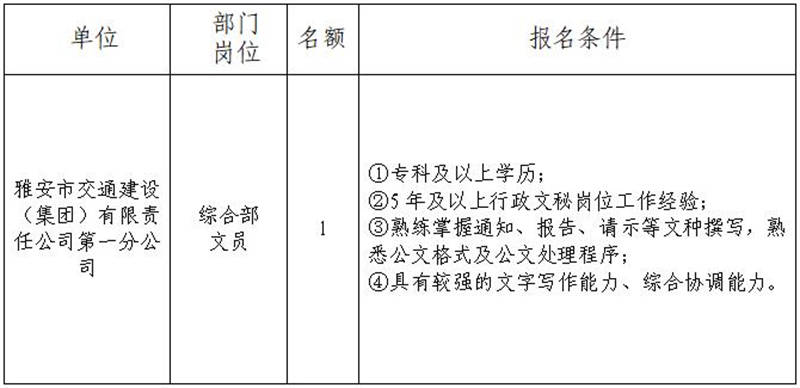 根據(jù)發(fā)展需要,決定面向社會(huì)公開(kāi)招聘雅安市交通建設(shè)(集團(tuán))有限責(zé)任公司(以下簡(jiǎn)稱“雅安交建集團(tuán)”)所屬分公司工作人員1名,現(xiàn)將有關(guān)事項(xiàng)公告如下: