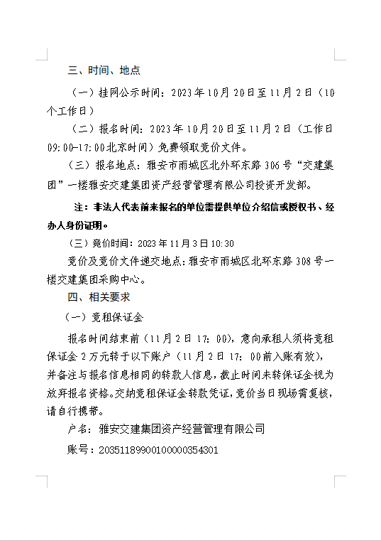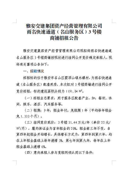 雅安交建集團(tuán)資產(chǎn)經(jīng)營管理有限公司 雨名快速通道(名山服務(wù)區(qū))3號樓商鋪招租公告