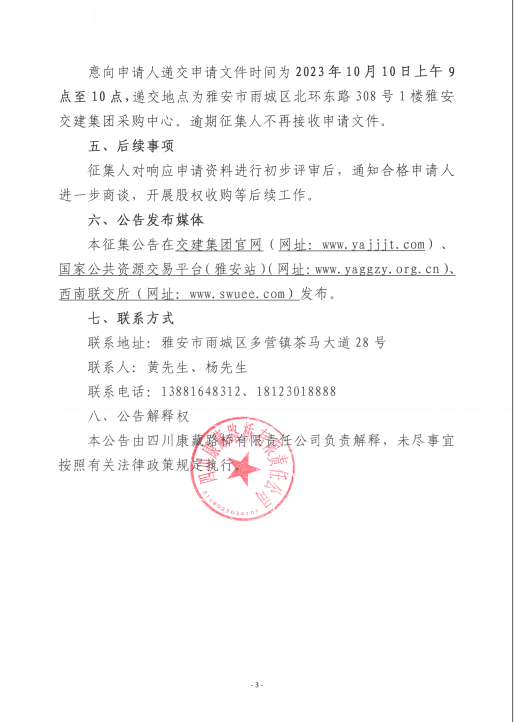 四川康藏路橋有限責(zé)任公司關(guān)于股權(quán)收購隧道工程施工企業(yè)征集公告(第二次)