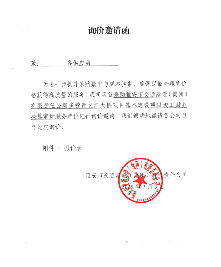 詢價(jià)邀請(qǐng)函——采購(gòu)雅安市交通建設(shè)(集團(tuán))有限責(zé)任公司多營(yíng)青衣江大橋項(xiàng)目基本建設(shè)項(xiàng)目竣工財(cái)務(wù)決算審計(jì)服務(wù)單位
