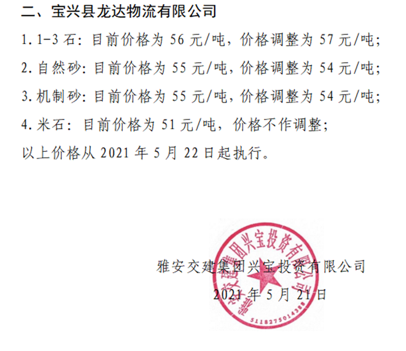 雅安交建集團(tuán)興寶公司砂石骨料銷售價格情況表(2021.5.22)