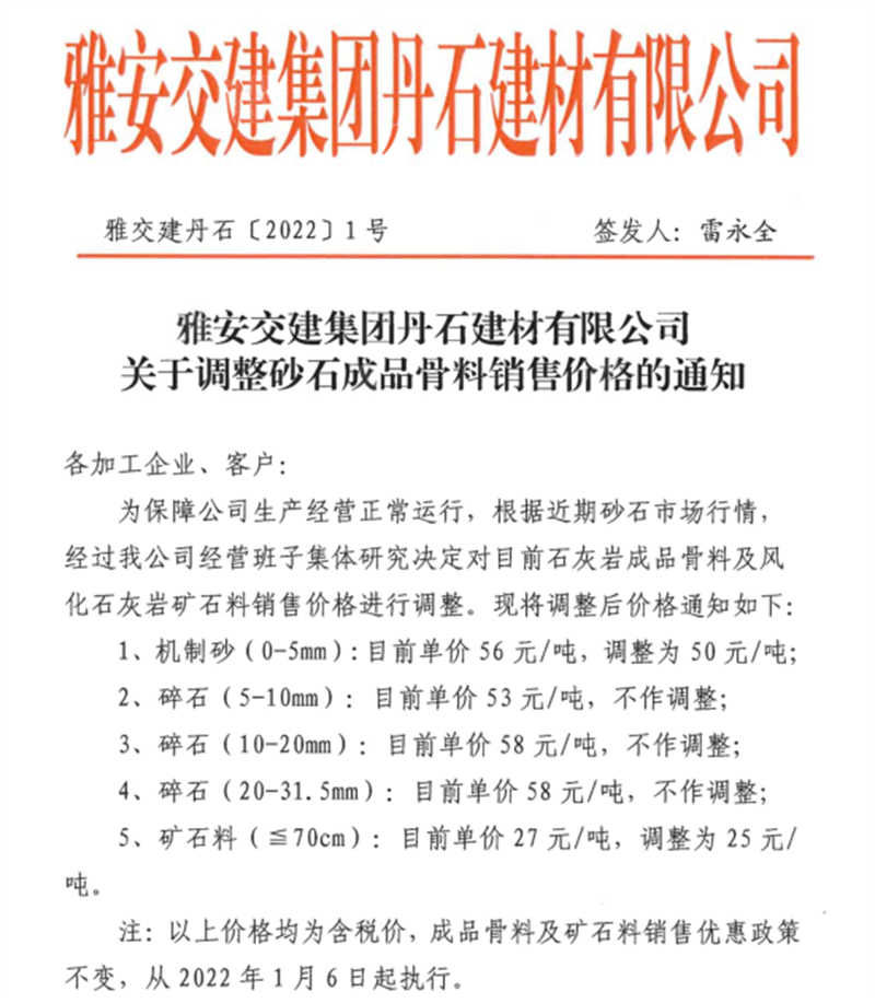 雅安交建集團(tuán)丹石公司關(guān)于調(diào)整砂石成品骨料銷(xiāo)售價(jià)格的通知(2022.1.5)