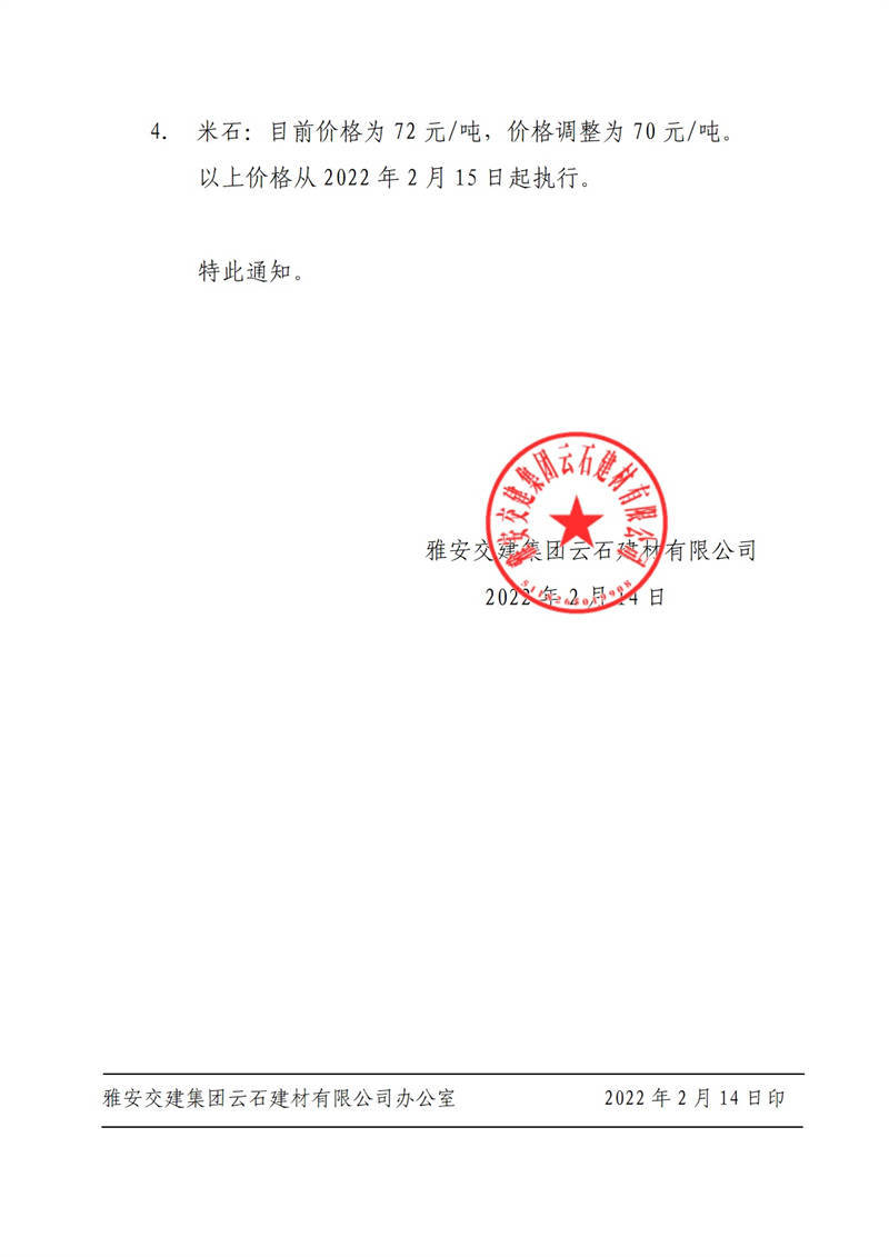 雅安交建集團(tuán)云石建材有限公司關(guān)于調(diào)整成品料價(jià)格的通知(2022-2-14)