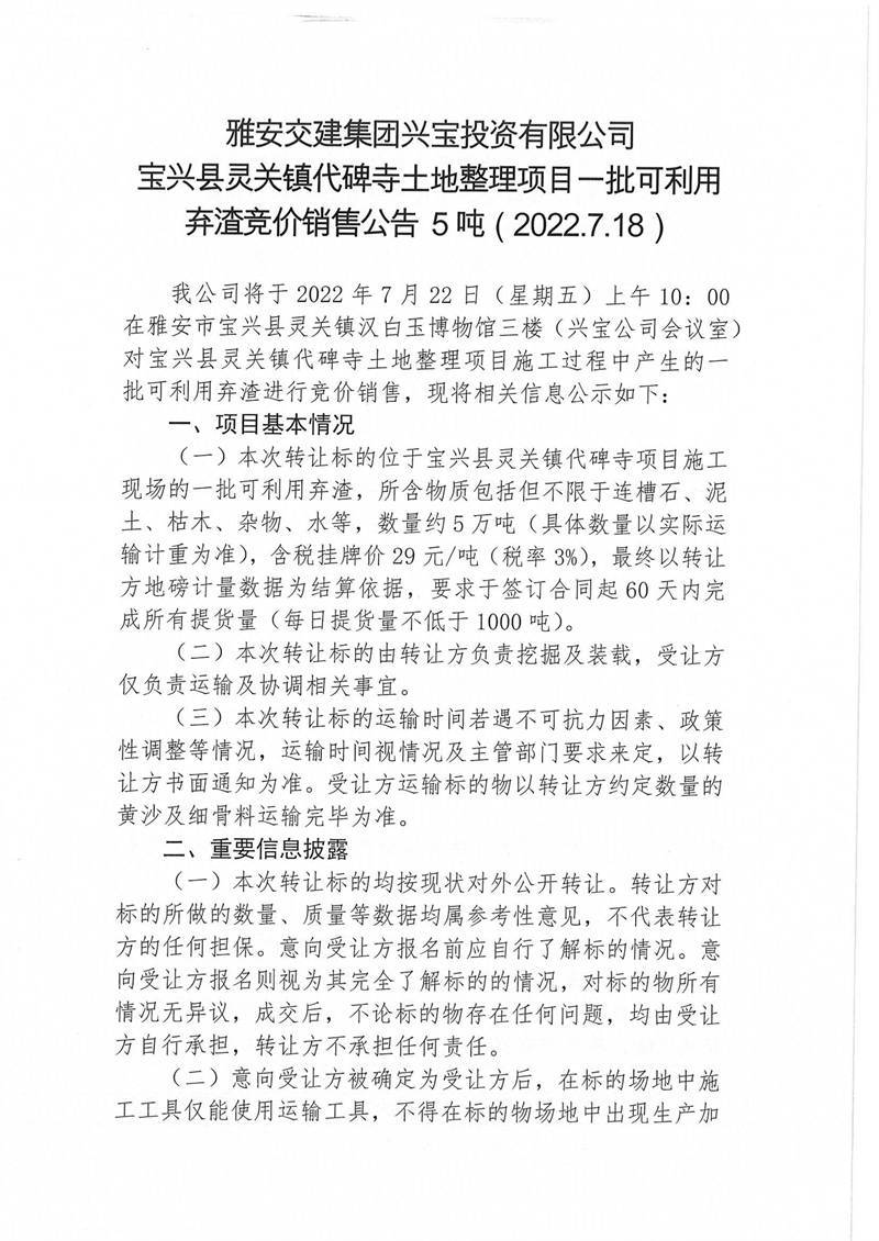 寶興縣靈關(guān)鎮(zhèn)代碑寺土地整理項(xiàng)目一批可利用棄渣競(jìng)價(jià)銷(xiāo)售公告7.15(5萬(wàn)噸)