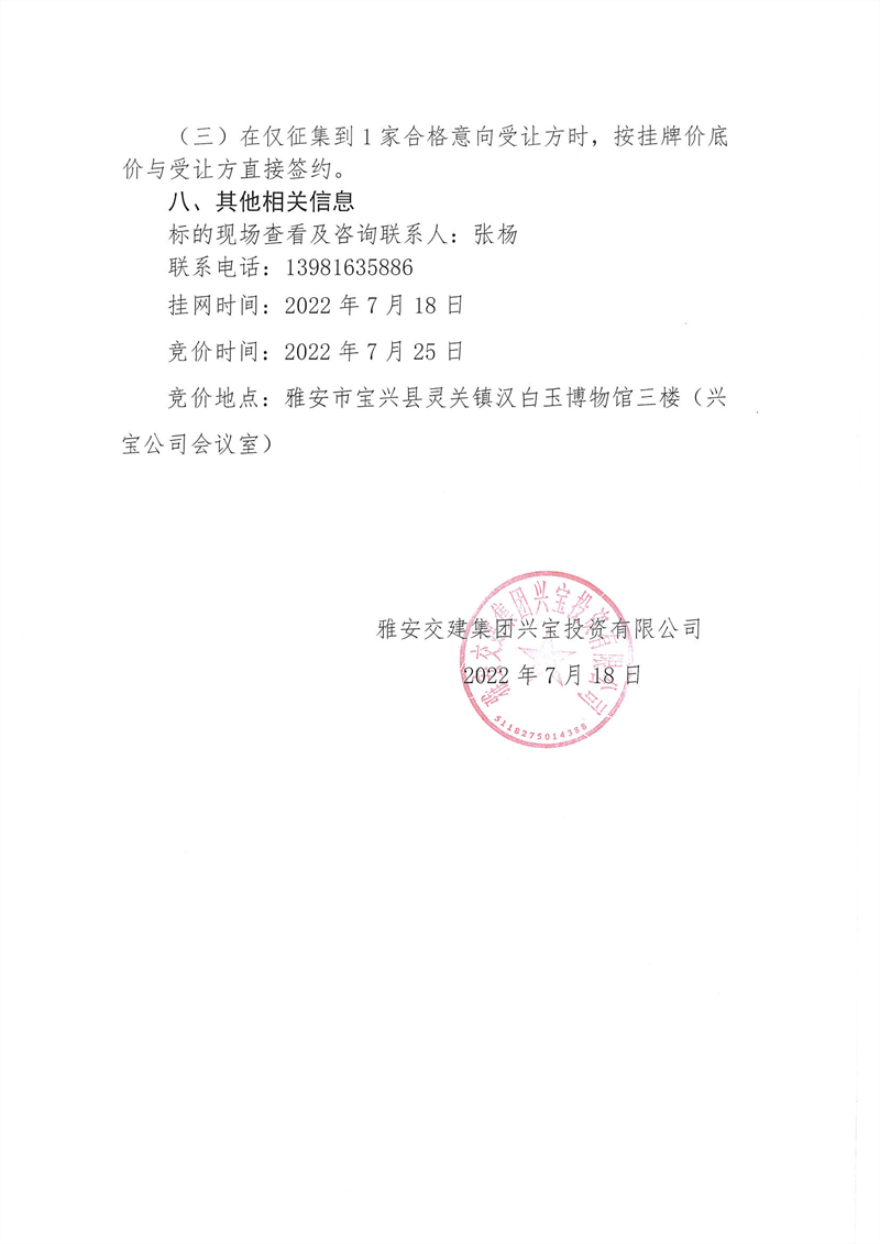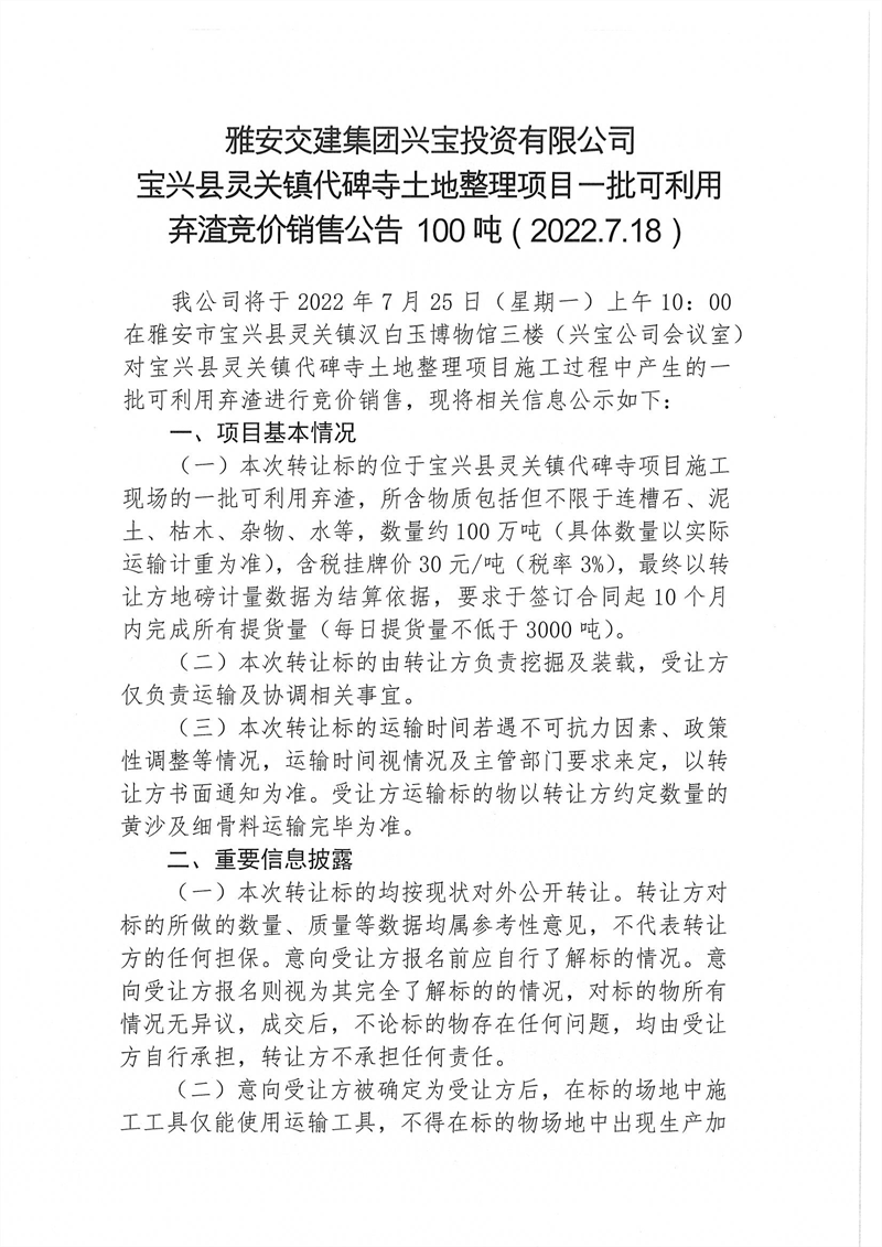興寶公司寶興縣靈關(guān)鎮(zhèn)代碑寺土地整理項(xiàng)目10萬(wàn)噸可利用棄渣競(jìng)價(jià)銷(xiāo)售掛網(wǎng)公告掛網(wǎng)公告7.22(5萬(wàn)噸)