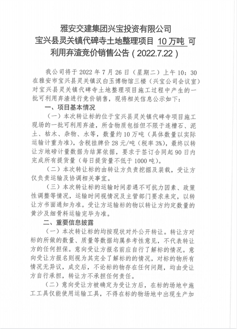 興寶公司寶興縣靈關鎮(zhèn)代碑寺土地整理項目10萬噸可利用棄渣競價銷售掛網(wǎng)公告掛網(wǎng)公告7.22(5萬噸)