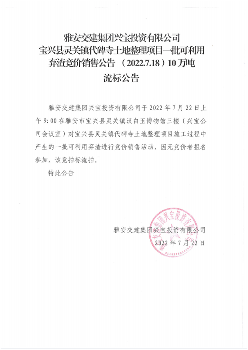 興寶公司寶興縣靈關(guān)鎮(zhèn)代碑寺土地整理項(xiàng)目10萬(wàn)噸可利用棄渣競(jìng)價(jià)銷(xiāo)售掛網(wǎng)公告7.22(10萬(wàn)噸)