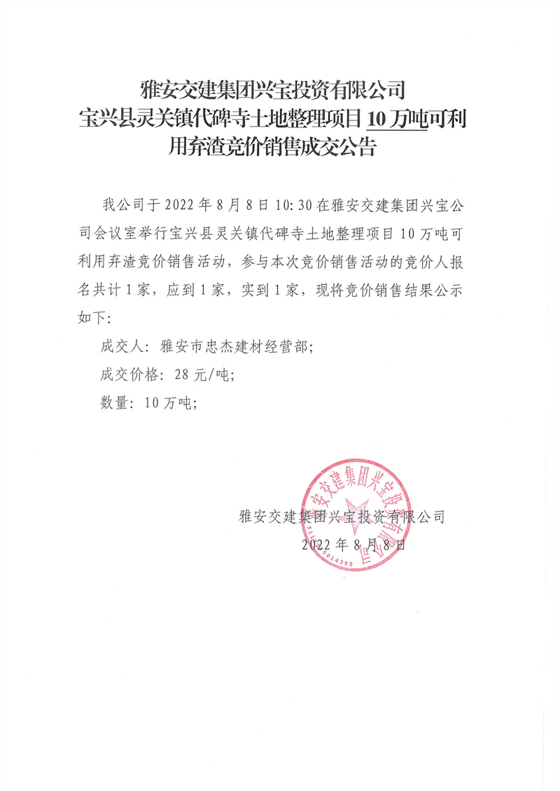 代碑寺土地整理項(xiàng)目100萬噸可利用棄渣競價(jià)銷售成交公告