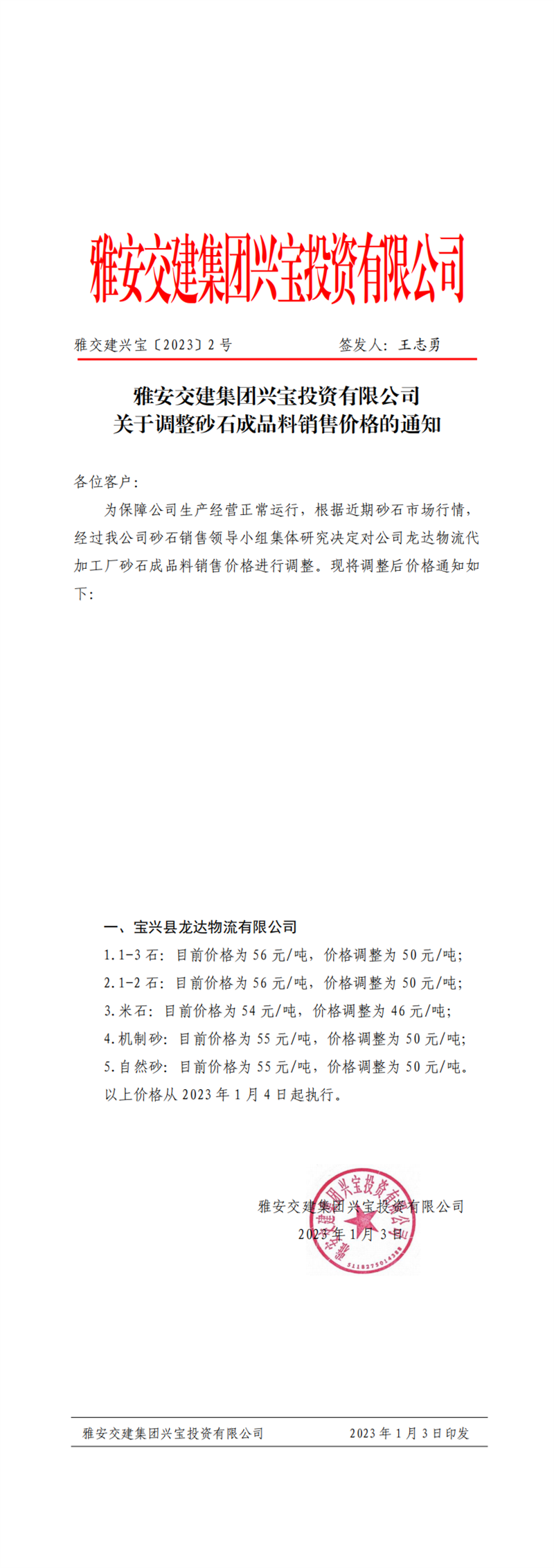 雅交建興寶〔2023〕2號 關(guān)于調(diào)整砂石成品料銷售價格的通知-2023-01-03