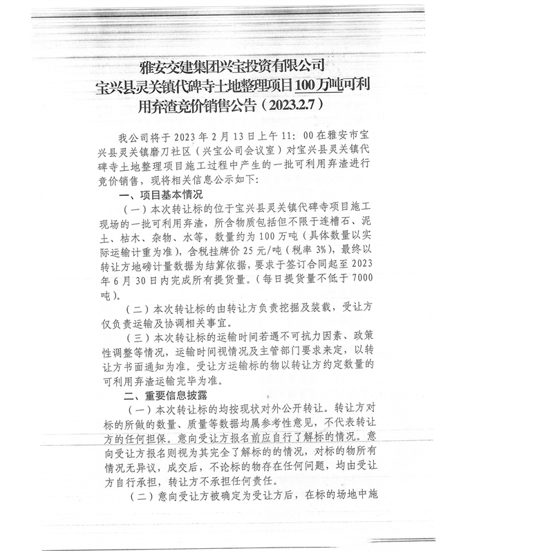 雅安交建集團(tuán)興寶投資有限公司靈關(guān)鎮(zhèn)代碑寺土地整理項(xiàng)目100萬噸可利用棄渣競價(jià)銷售公告(2023.2.7)